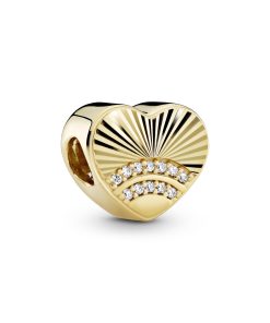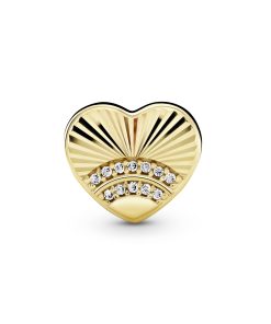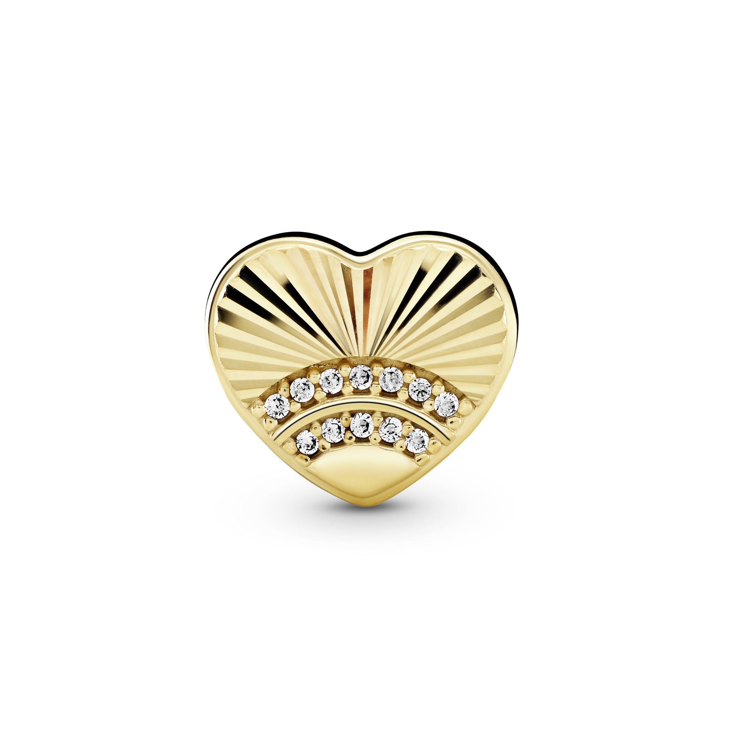 Put a little love into your look with our 14k Gold Plated heart charm. made from our unique metal blend plated with 18k gold. In a nod to Art Deco. it’s set with two arched rows of cubic zirconia and detailed with a raised pattern that lends dimension to the piece. The hand-finished charm is a perfect way to wear or share the love on Pandora Moments bracelets. You can even try styling it as a necklace pendant on a favourite chain.