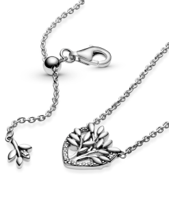 Keep your loved ones close with the Heart Family Tree Collier Necklace. Hand-finished in sterling silver. the outline of this openwork heart-shaped pendant is decorated with sparkling clear stones. Our iconic family tree motif is nestled inside and features polished leaf details. Including a slider clasp for an adjustable fit. a leaf branch detail decorated with a single stone is attached to the end of the chain. Wear this detailed piece as a reminder of your special connections.