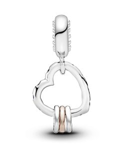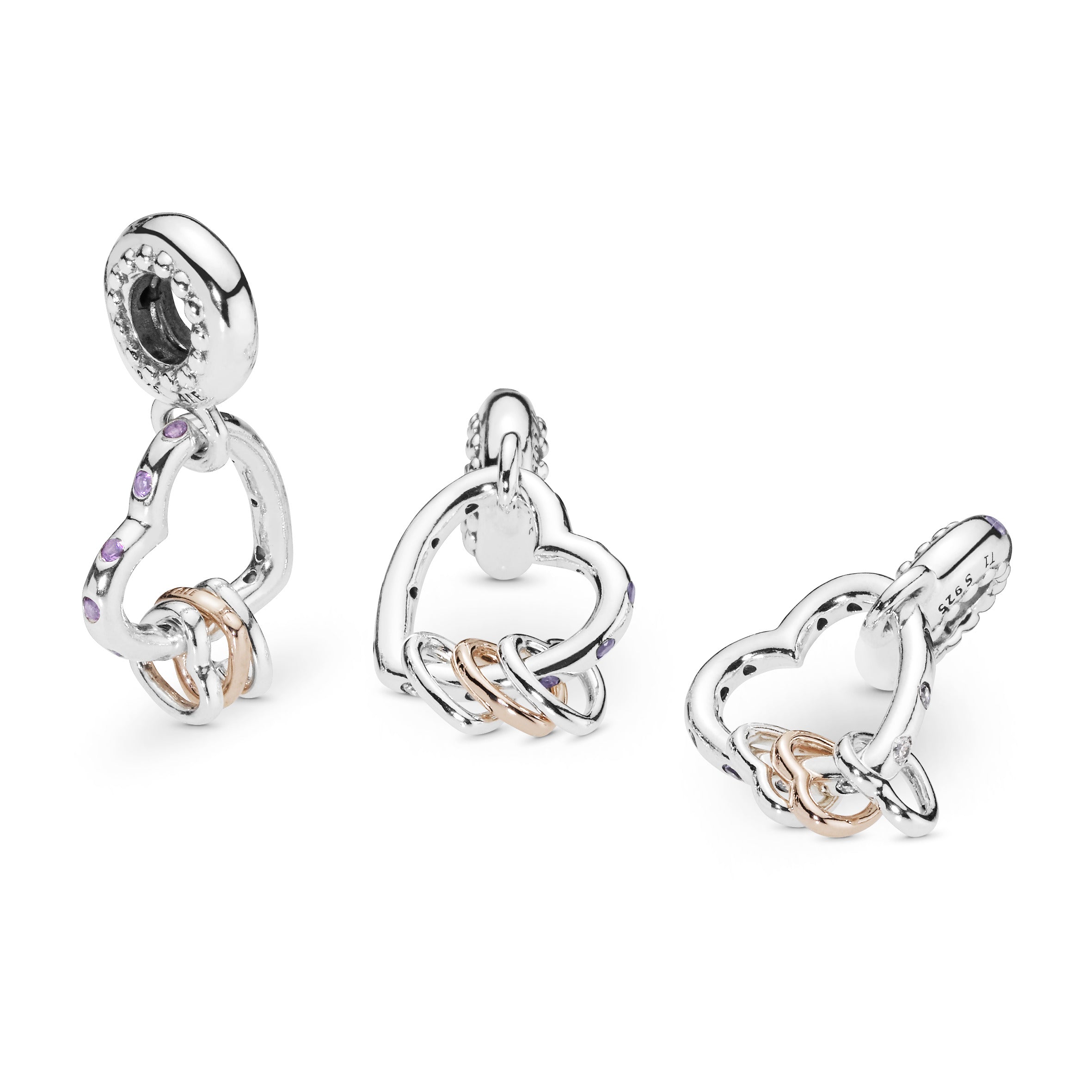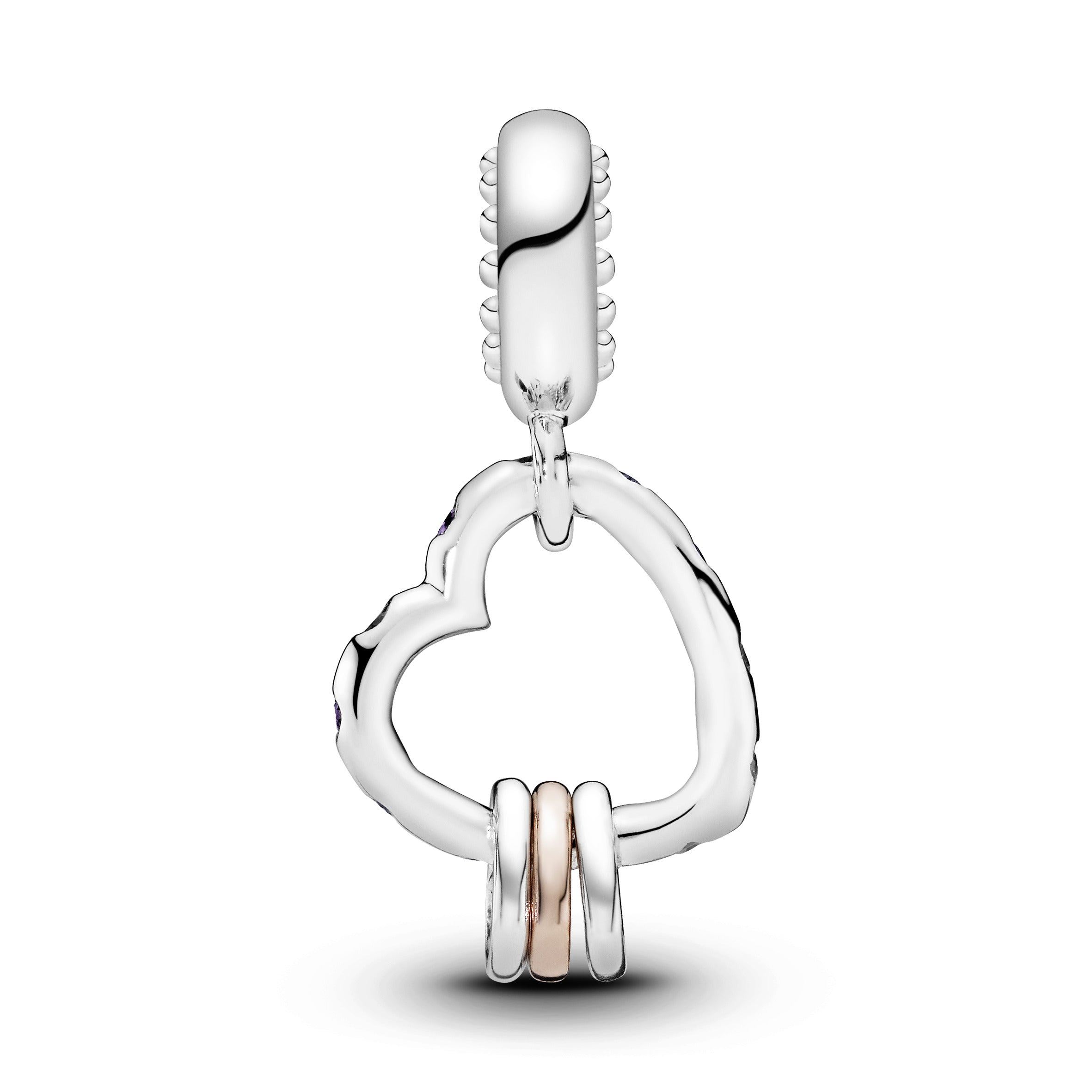 Hearts can hold so much love. Show the things that mean the most to you on your Pandora Moments bracelet. Shaped from sterling silver. this heart dangle charm holds miniature hearts. one of which is made from Pandora Rose. our unique metal blend with 14k rose gold plating. The large heart and bail are detailed with crystals and cubic zirconia for subtle sparkle.