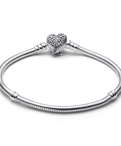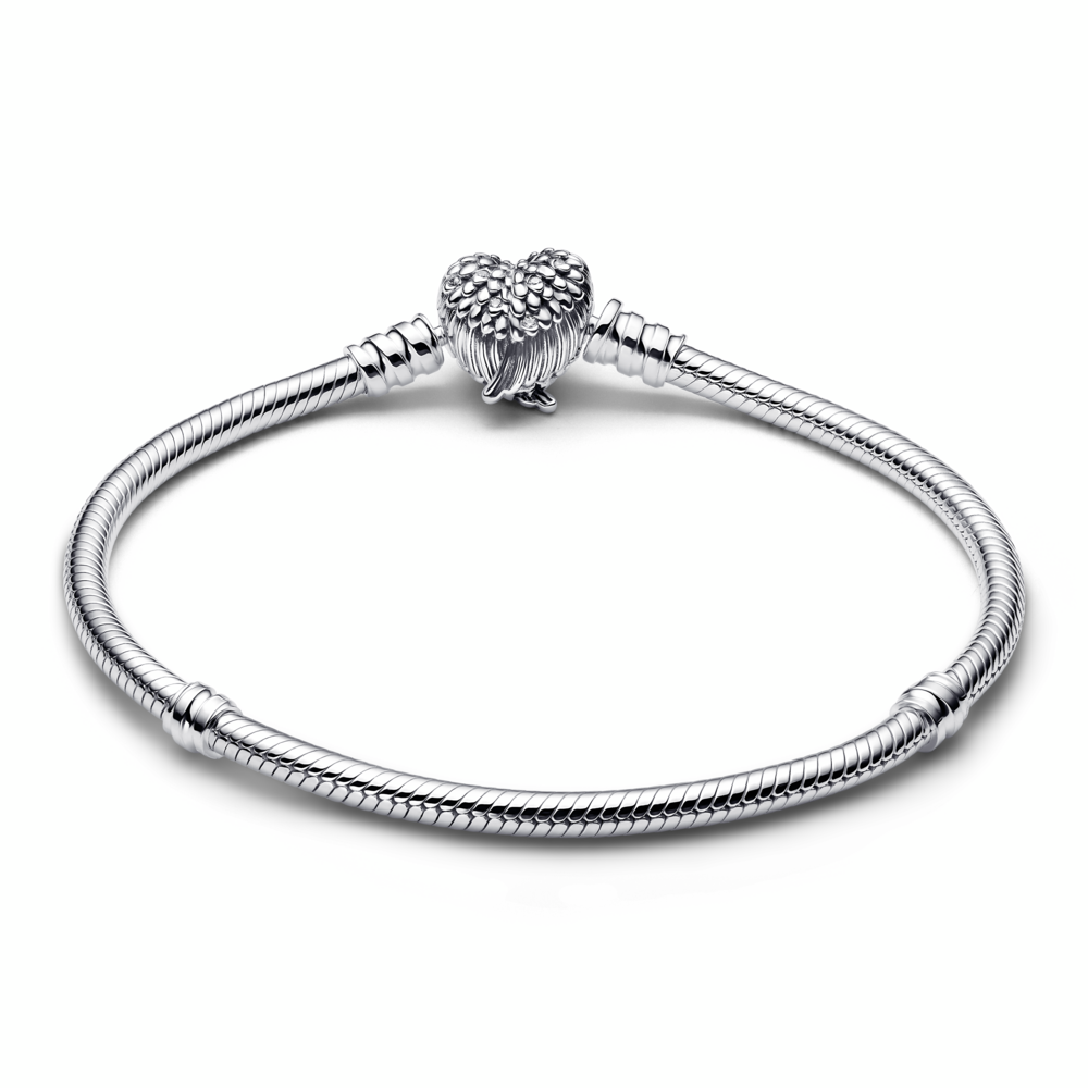 Snake chain sterling silver bracelet with heart wings clasp and clear cubic zirconia