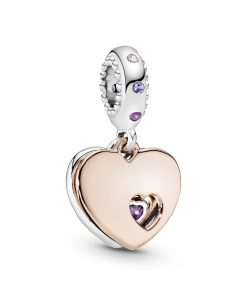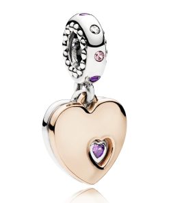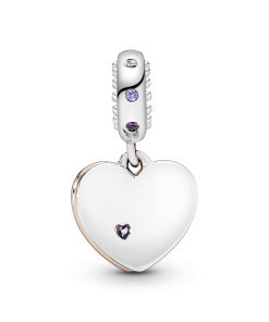Show that two hearts are better than one with this hand-finished sterling silver and Pandora Rose (14k rose gold-plated unique metal blend) charm. The two-tone dangle charm is shaped as contrasting hearts that join to become one. Embellished with stones and crystal. it’s also engraved with the message In my heart. Wear or share this Pandora Moments charm to keep memories close to your heart forever.