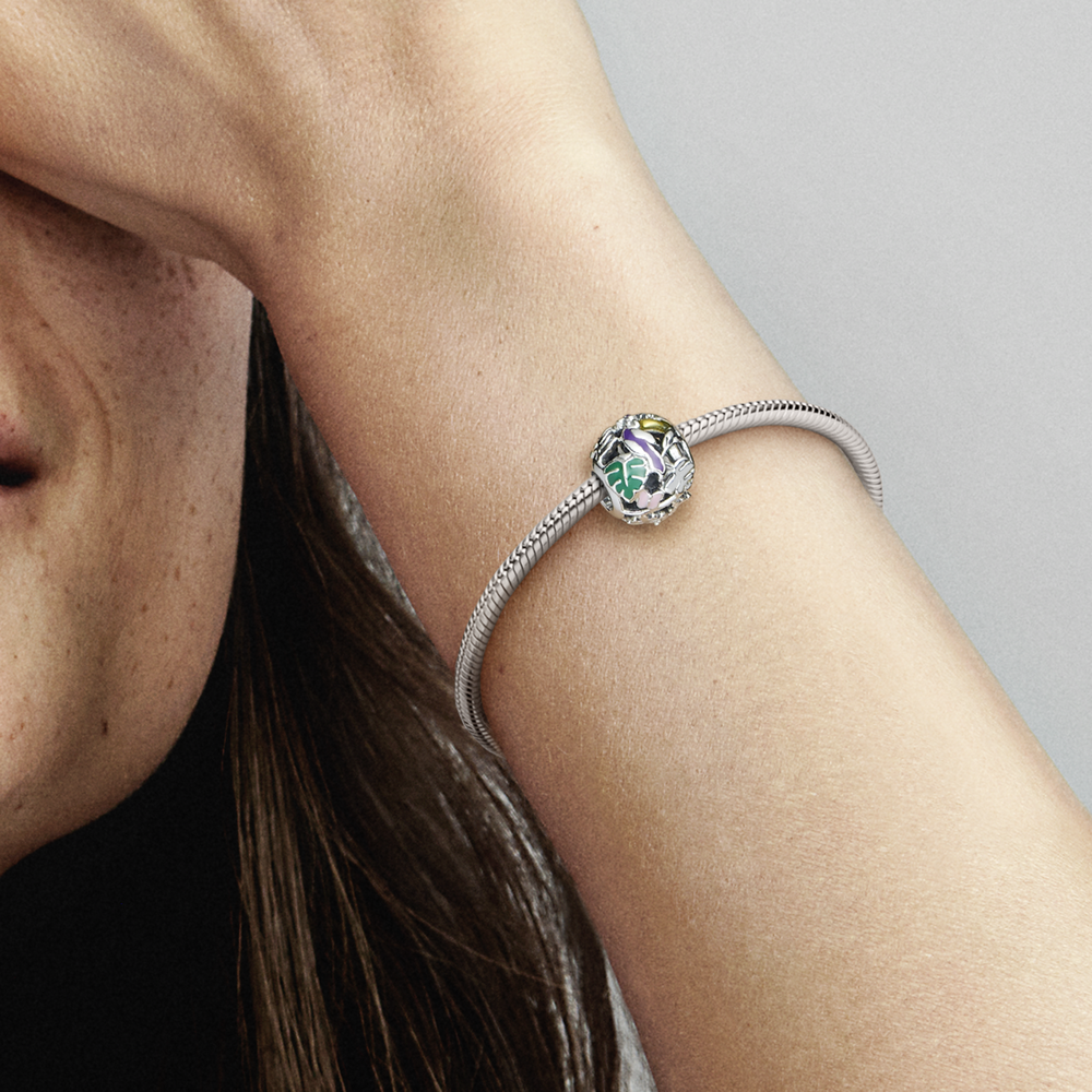 Welcome to the jungle! Peek between the lush tropical leaves and spot colourful birds and butterflies. This sterling silver openwork charm features an intricate pattern of leaves and jungle creatures highlighted in hand-applied enamel. Style it on your favourite bracelet. necklace or hoops and dream of a leafy green paradise.