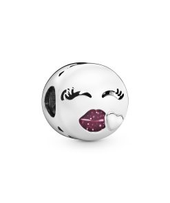 Show how you feel without saying a word with this emoji charm. Hand-finished in sterling silver and featuring glitter enamel. the playful piece is also detailed with cut-out hearts. a pink pout and luscious lashes. The Emoticon Kiss Charm is perfect for adding a bit of attitude to your Pandora Moments bracelet or as a gift to the emoji lover in your life.