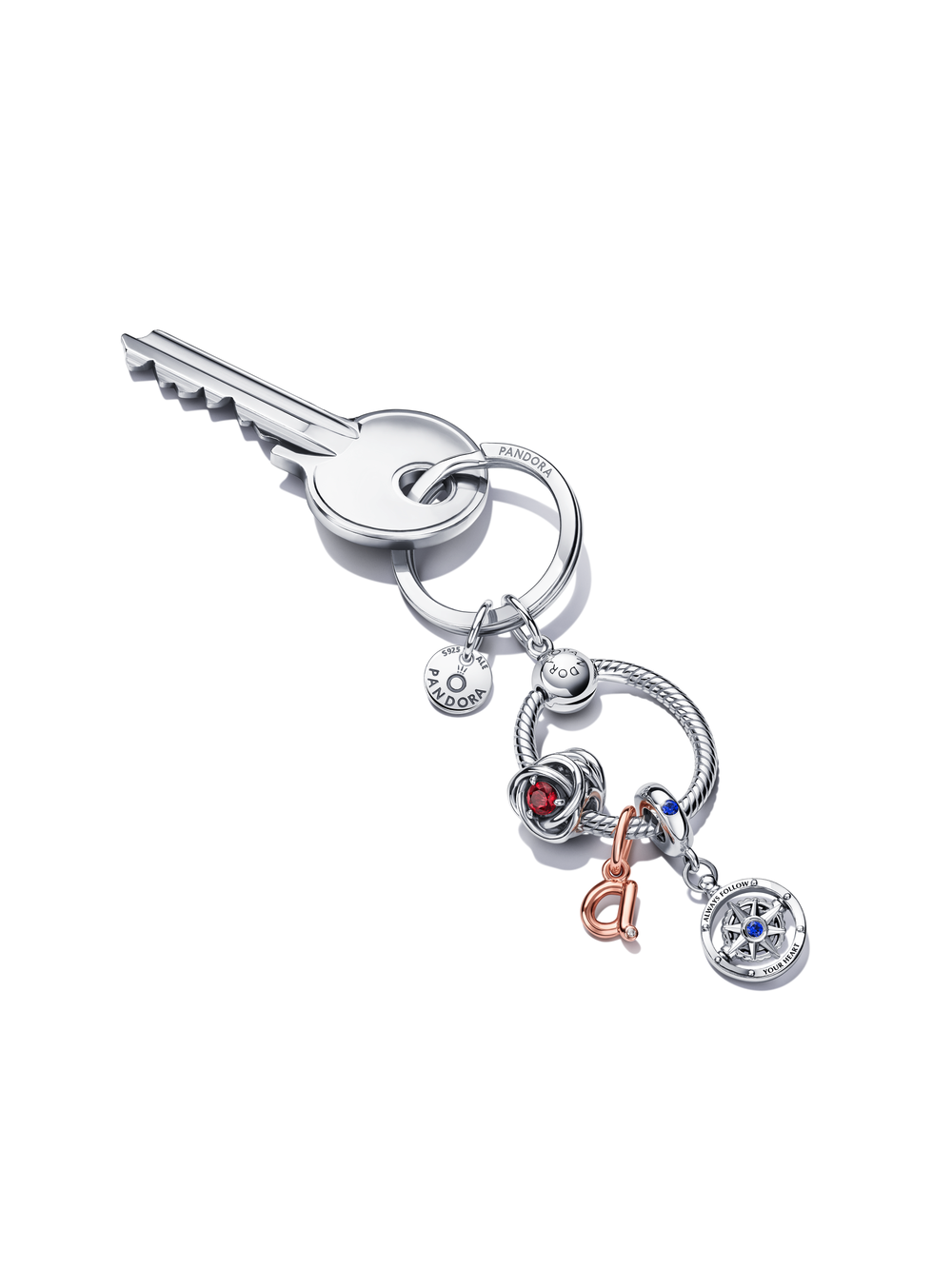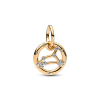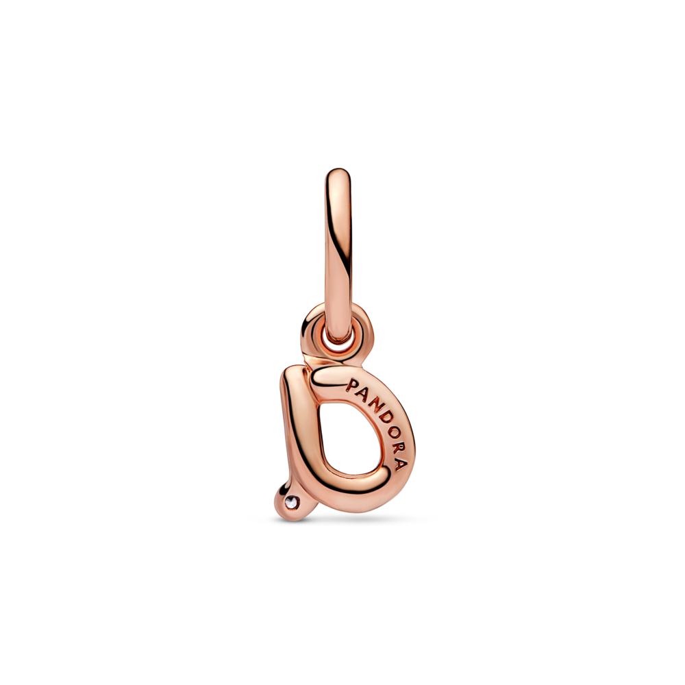 Special features: Three-dimensional bend wire shaped like an a; Pandora logo engraved on back; stone set in front of the letter; oval-shaped closed bail.