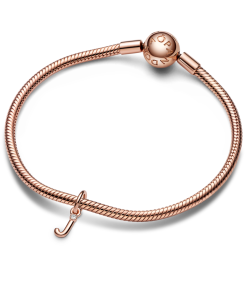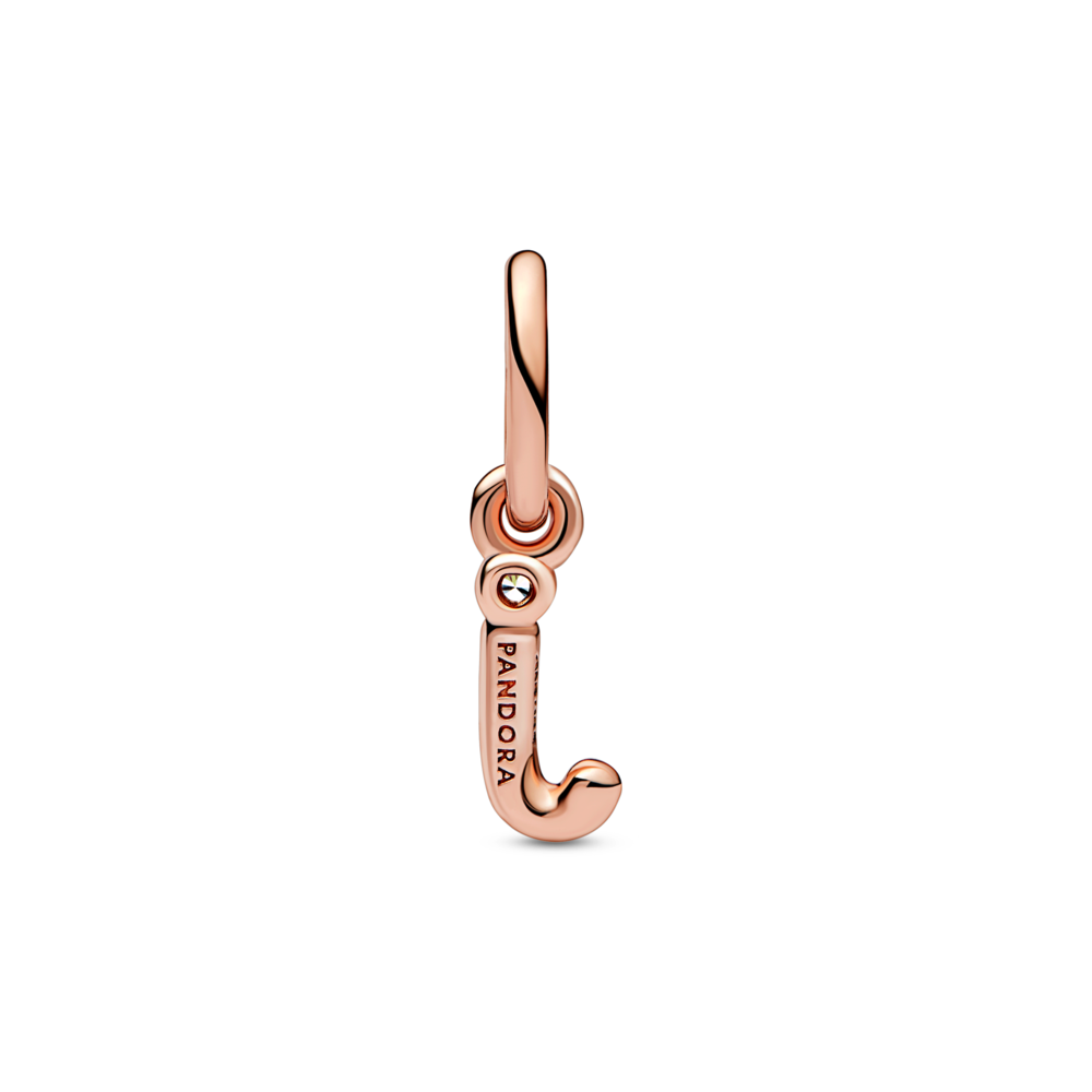 Special features: Three-dimensional bend wire shaped like a j; Pandora logo engraved on back; stone set in front of the letter; oval-shaped closed bail.