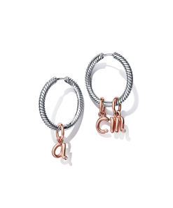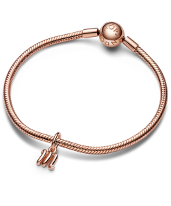 Special features: Three-dimensional bend wire shaped like an m; Pandora logo engraved on back; stone set in front of the letter; oval-shaped closed bail.