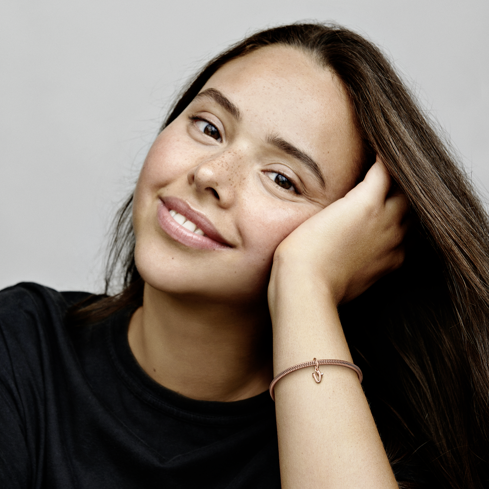Special features: Three-dimensional bend wire shaped like a v; Pandora logo engraved on back; stone set in front of the letter; oval-shaped closed bail.