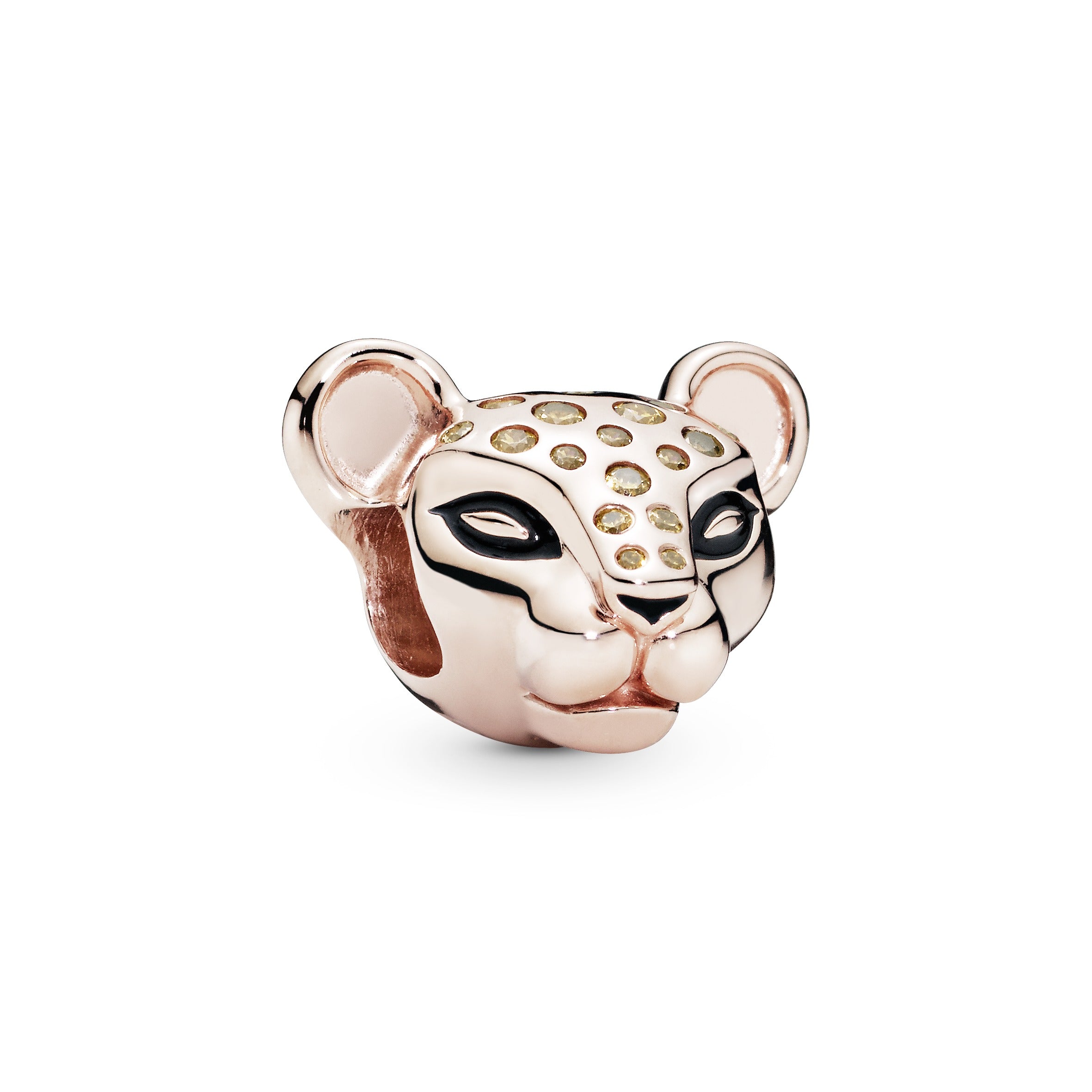 Tell your story of courage and strength with this Pandora Rose charm. Hand-finished in Pandora Rose. our 14k rose gold-plated unique metal blend. this powerful lioness charm is expertly detailed with honey-coloured cubic zirconia and hand-applied black enamel features. A fierce addition to any look. wear the lioness charm on your Pandora Moments bracelet or bangle.
