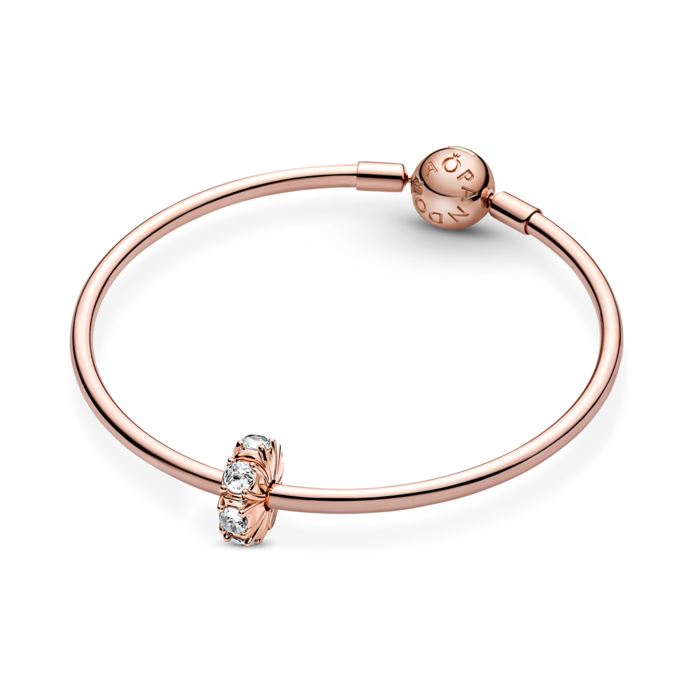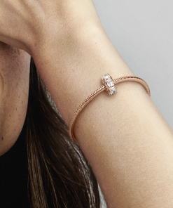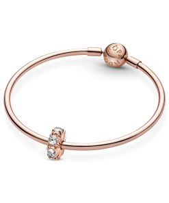 Choose sleek style with the Long Pronged Sparkling Clip Charm. Hand-finished in 14k rose gold-plated unique metal blend. this charm features a line of cubic zirconia stones set with visible prongs that highlight the stones’ sparkle and form an intricate design on the charm’s sides. When clipped onto a snake chain charm holder. the charm will stay in a fixed position thanks to silicone grips. Designed to catch the light. this sparkling charm will elevate any look.