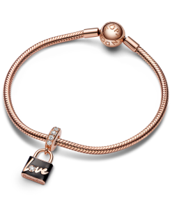 Special features: enamel on four sides of the padlock; polished lifted script on the front of the padlock; stone set in the o of the script; polished lifted heart in center on the back of the padlock; engraving on the bottom of the padlock; row of pavé along the bail.