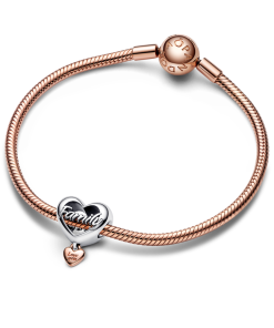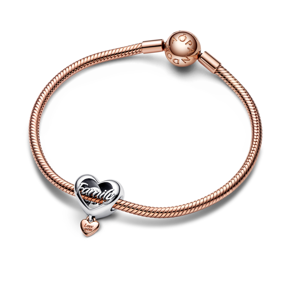 Show your appreciation for the dearest people in your life with the Love You Family Heart Charm. Crafted from sterling silver. this heart-shaped design features the word Family in openwork script on both sides. A small heart-shaped dangle in 14k rose gold plating adds a heartfelt touch. with the words Love you engraved on both sides. A beautiful gift for a family member. or a meaningful symbol to wear on your own jewellery and keep your loved ones close.