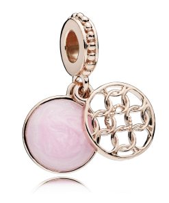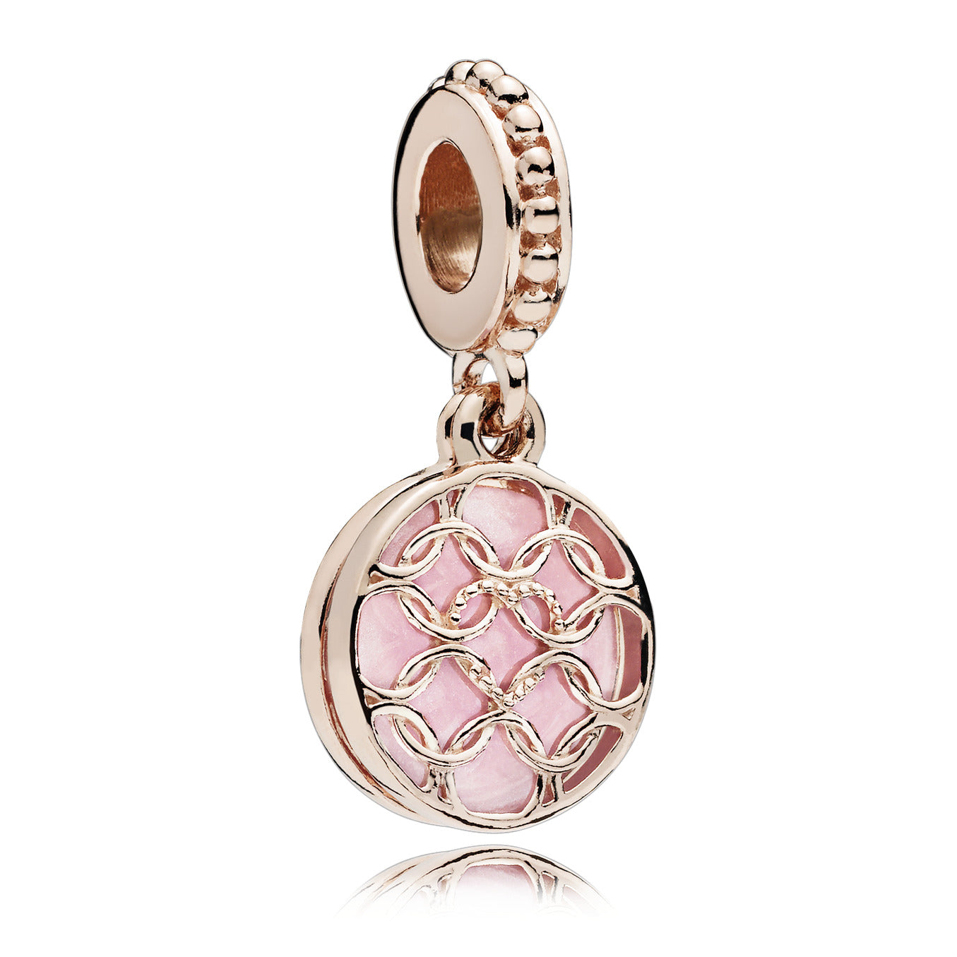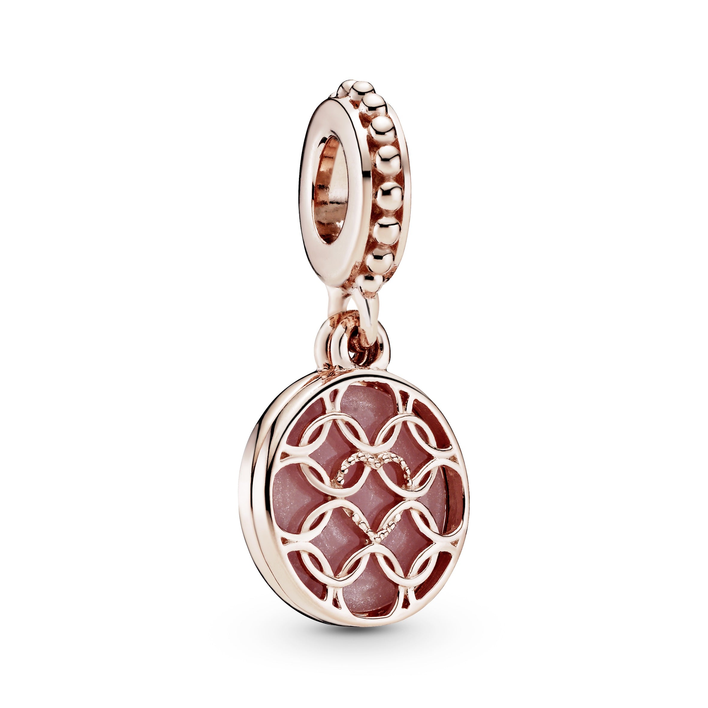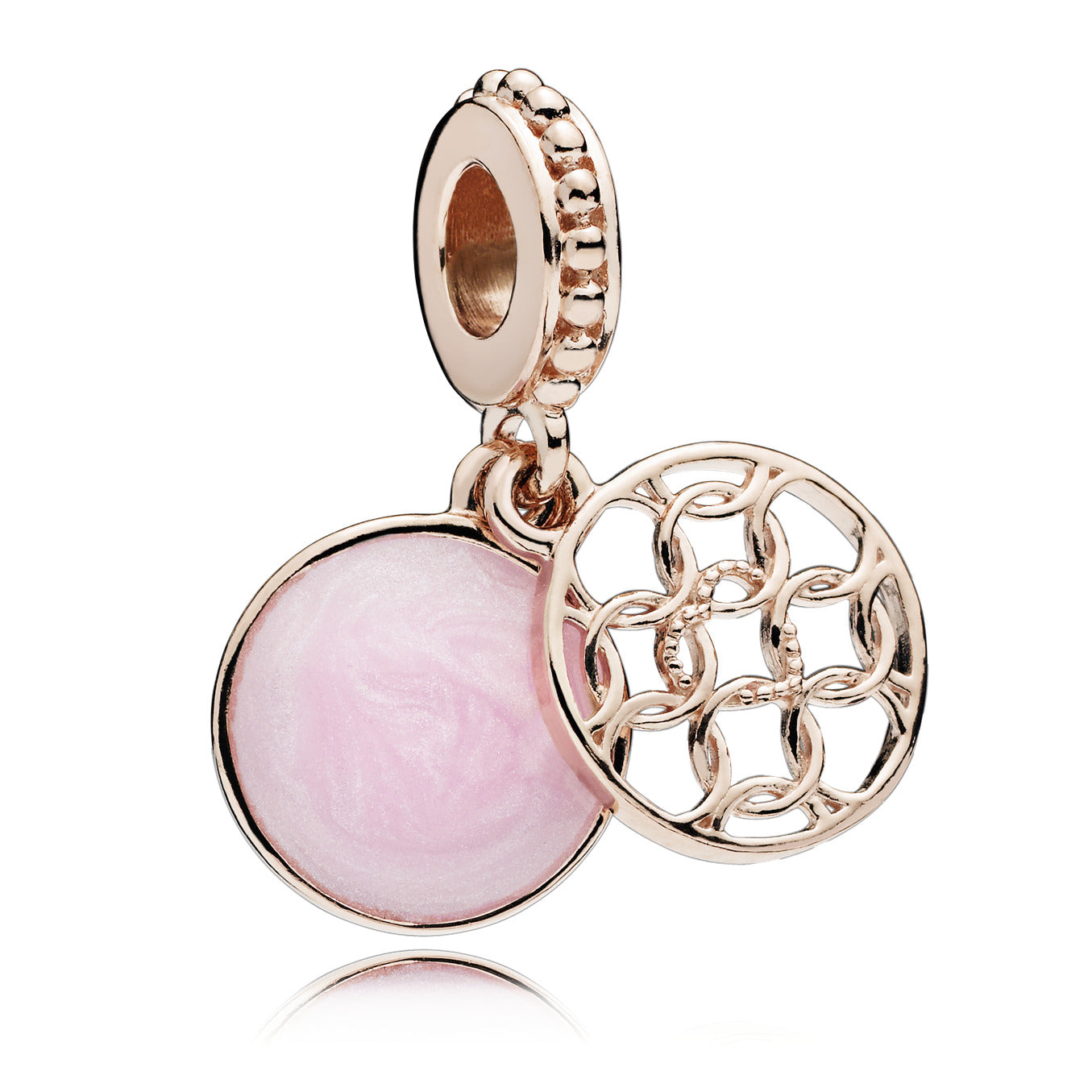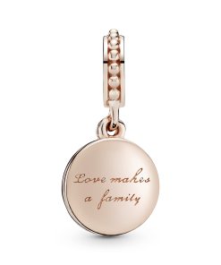 Made from Pandora Rose. our unique metal blend plated with 14k rose gold. this pink-hued dangle charm pays tribute to family bonds—whatever shape they take. The split design is finished with hand-applied pink enamel and the engraving Love makes a family. Wear it as a charm on Pandora Moments bracelets or as a pendant on a necklace chain to show that love is at the heart of creation.