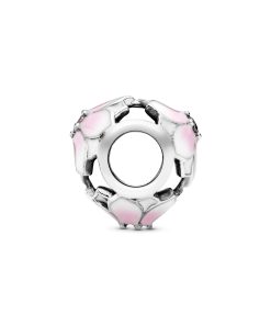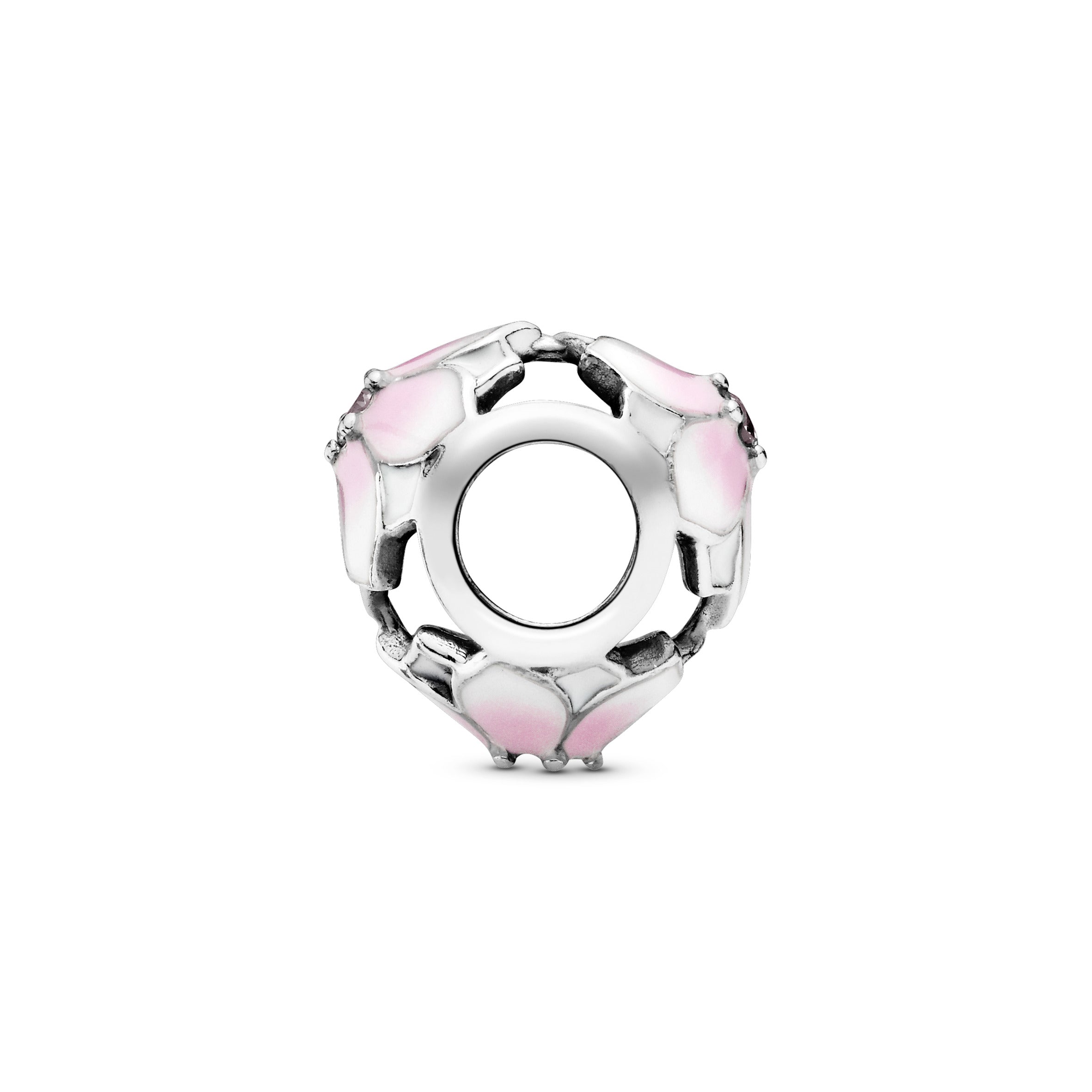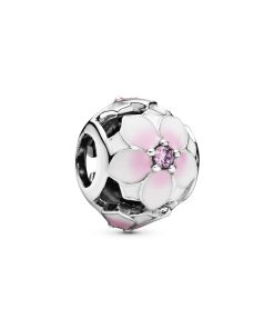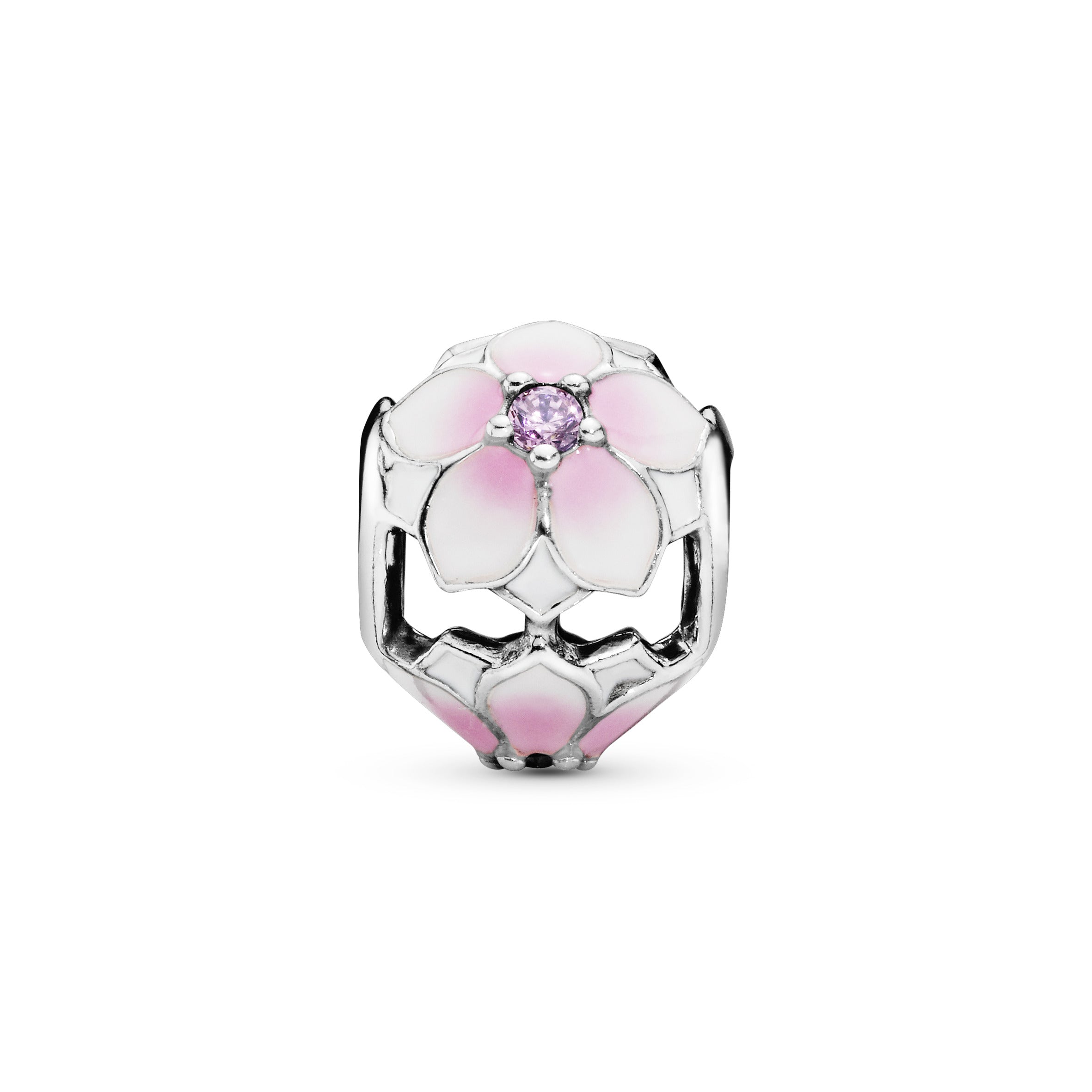 Add nature-inspired elements to your look with this magnolia-inspired flower charm featuring openwork details. Carefully hand-finished. the sterling silver charm is set with sparkling cubic zirconia that add a hit of sparkle. The petals are hand-painted with pink and white enamel that adds vibrancy and a pop of colour. Add floral accents and a pop of colour to your look or gift it to the flower lover in your life.