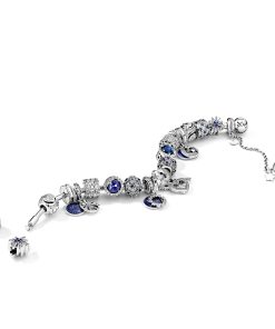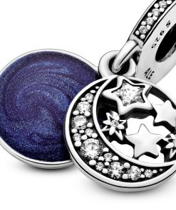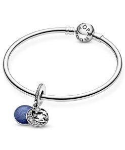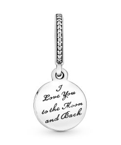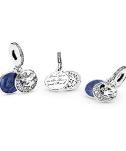 Express your love in the most beautiful way possible with this magical Moon & Blue Sky Dangle charm. Crafted in sterling silver. this exquisite piece features two double-sided pendants decorated with blue enamel. shimmering cubic zirconia stones and the engraving ‘I love you to moon and back.’ Wear it with other blue and sterling silver charms on a snake chain bracelet or as a single pendant on a Pandora necklace chain.