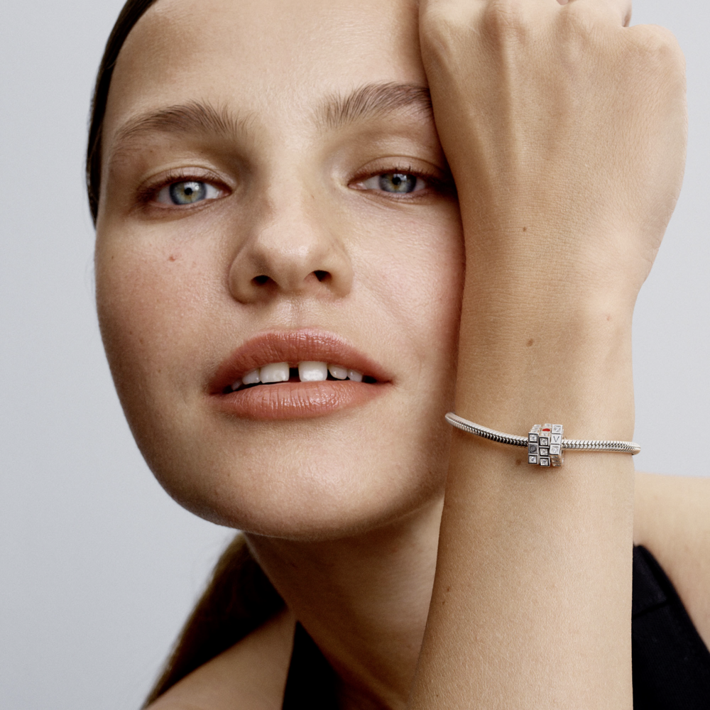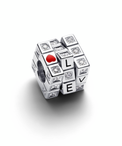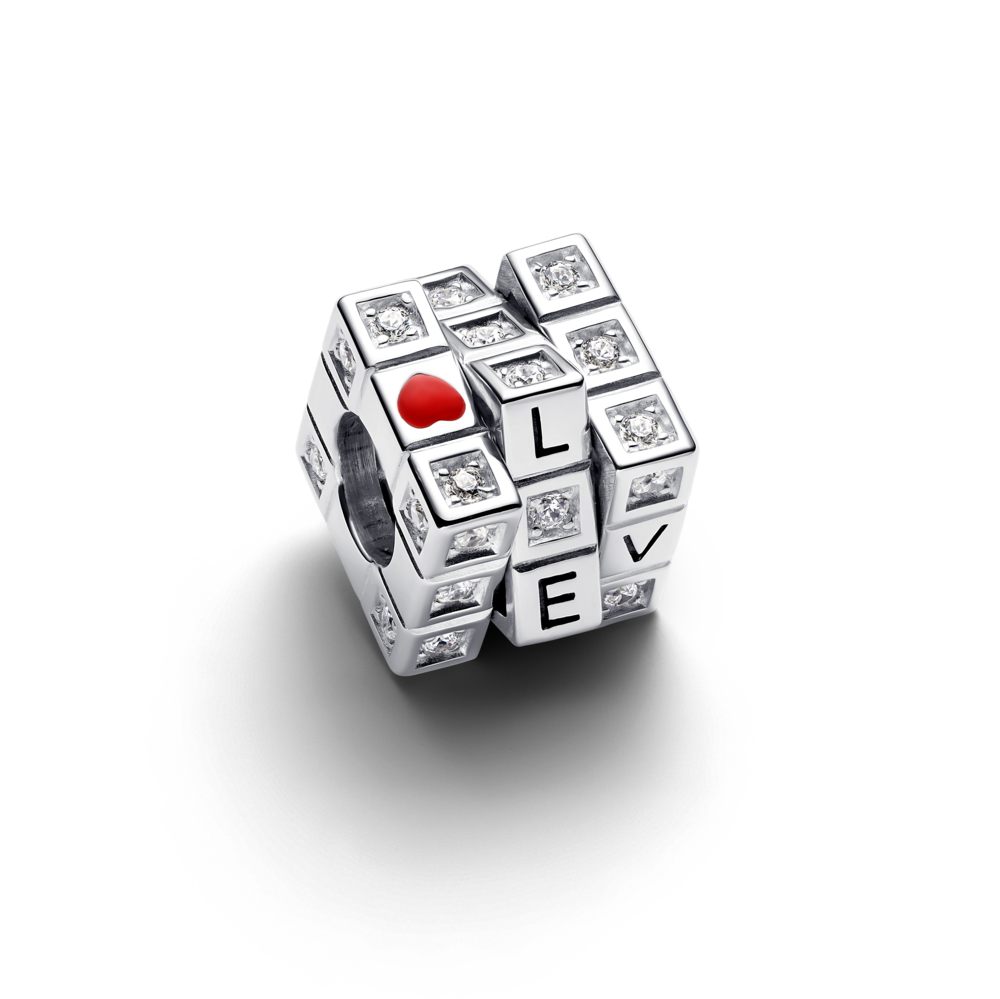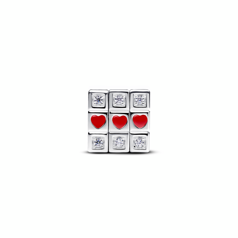 Toy cube sterling silver charm with clear cubic zirconia and red enamel