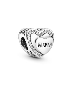 Show who you are or someone you love what they mean to you with this heart-shaped charm. made for mums and mother figures (and Pandora Moments bracelets). The double-sided. sterling silver design is framed with cubic zirconia and cut-out hearts and the small. off-centre heart is engraved with Mum in a lasting tribute to the special lady.