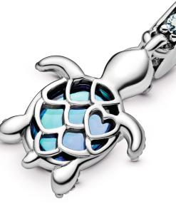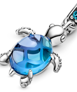 The Murano Glass Sea Turtle Dangle Charm is inspired by the peaceful creatures of the deep blue sea. The sea turtle charm features bleached aqua blue crystals. icy green crystals and a single peacock Murano glass bead. The sterling silver cut-out pattern on the belly of the turtle features a heart and shines through the Murano glass to create a beautiful scale-like effect that dances with the light.