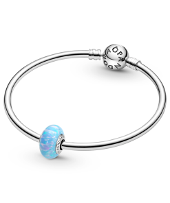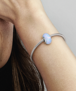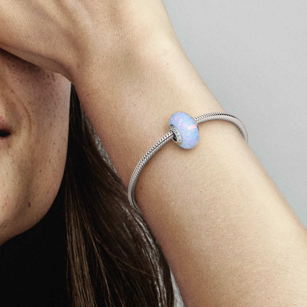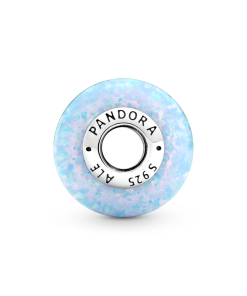 Inspired by shimmering blue ocean waves reflecting the summer sun. this beautiful lab-created opal charm is the perfect addition to your summer look. It features a sterling silver core with the Pandora logo on one side. surrounded by a lab-created opal shimmering with soft colours and glittering streaks. Each stone is unique. just like you.