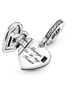 Style meets sentiment in the Openable Heart Locket Dangle Charm. Hand-finished in sterling silver. this charm features a heart with a clear cubic zirconia stone set in the centre. The heart opens to reveal the engraved message Always be in my heart. The bail features clear cubic zirconia for an extra dose of sparkle. Inspired by classic locket designs. this charm is elegant. heartfelt and meaningful no matter what you wear it with.