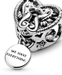 Show that your love goes all the way to the bottom of the ocean with this Openwork Seahorses Heart Charm. Hand-finished in sterling silver. this openwork charm with two kissing sea horses in love features hidden starfish details and delicate wave cut-outs on the sides. A polished round tag engraved with the heartfelt message When we have each other. we have everything dangles from the bottom of the heart and dances every time you move.