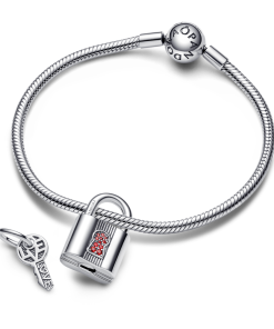 Special features: Openable curved padlock with engraved line details on the case; keyhole with pavé of stones in the center on one side of the padlock; Pandora logo engraved on the side of the shank; removable key with identical sides with raised Love message on bow and the blade; the O is cut-out and on blade it is shaped as a heart.