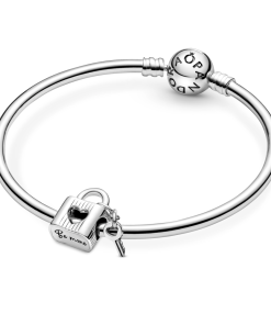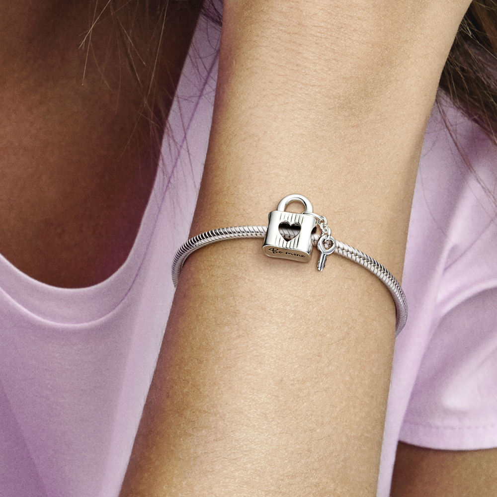 Whoever holds the key to your heart. celebrate your everlasting love with this meaningful Padlock & Heart Key Charm. Hand-finished in sterling silver. this special charm features the engraving Be Mine. with a cut out heart in the centre of the charm for the lock. Inspired by the locks that lovers attach to bridges around the world. this romantic Padlock and Heart Key Charm is completed with a dangling key with a matching cut-out heart. Gift it to yourself or your valentine for new way to keep your love close to you. wherever you go.