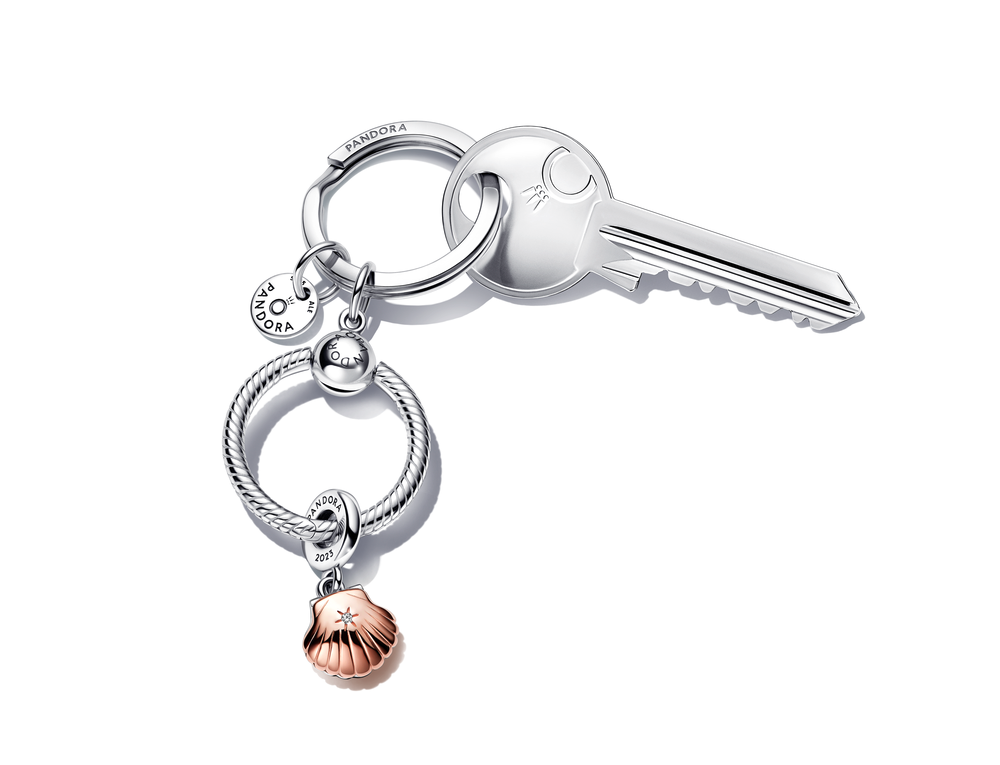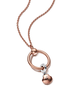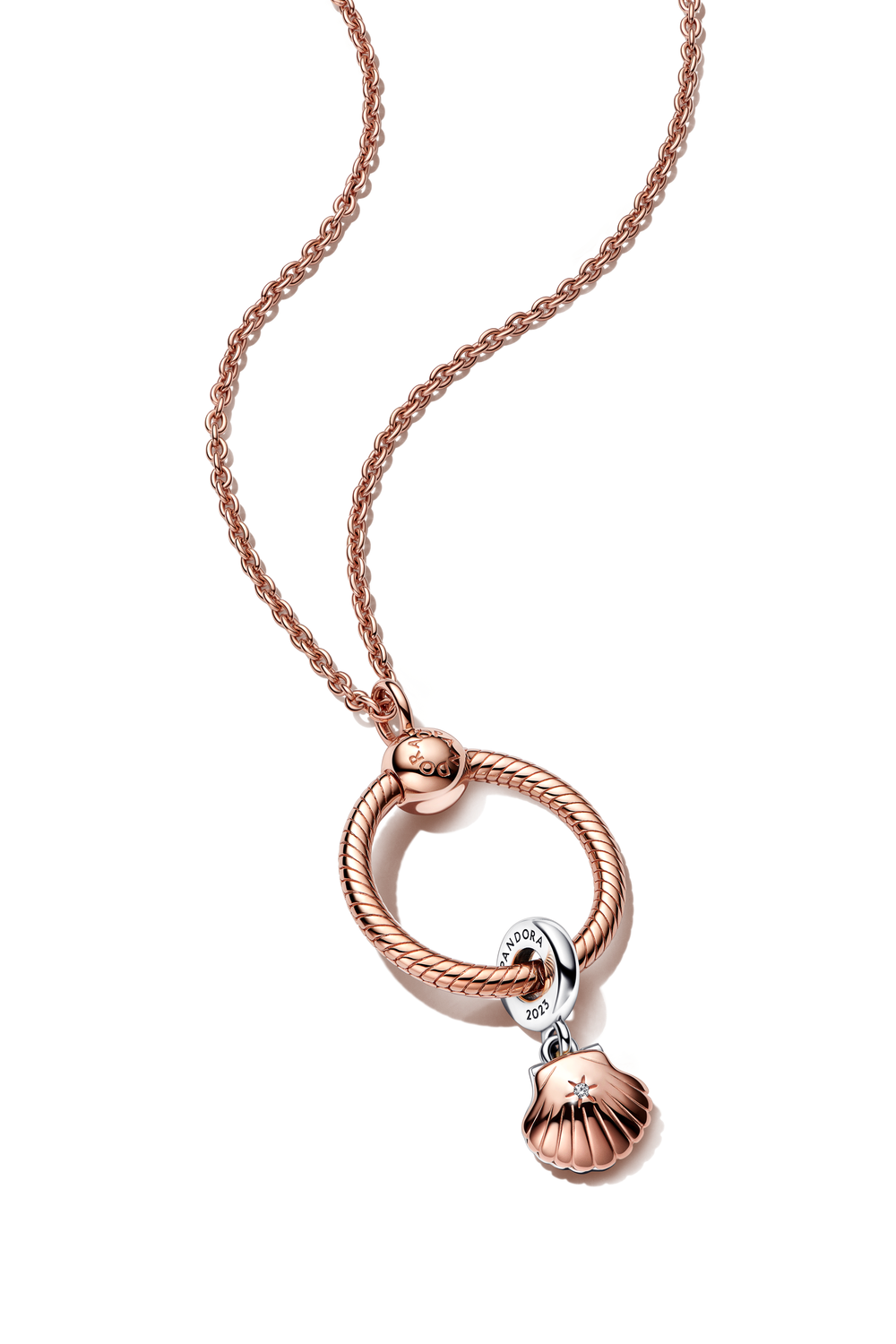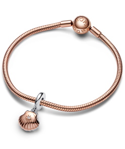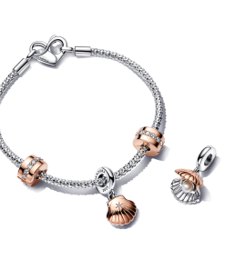 Special features: one half of the sea shell is 14k rose gold-plated with realistic shell texture; set with a lab-created diamond in a star; the other shell is sterling silver with openwork shell texture; engraved message on the top of the sterling silver sea shell part; inside the openable sea shell is a treated freshwater cultured pearl; 2023 + pandora logo engraved on side of bail