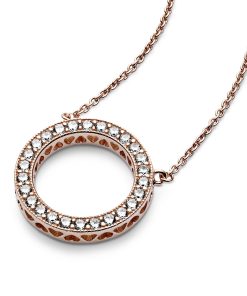 Bring your outfit full circle with this sparkling necklace crafted in Pandora Rose. a 14k rose gold-plated unique metal blend. The reversible pendant is framed with shimmering stones on one side. and embossed with the Pandora logo on the reverse – enabling you to create two different looks. The lobster clasp and jump ring are made from sterling silver plated with 14k rose gold. For extra versatility. the delicate chain is adjustable to three different lengths. Pair this circle necklace with the matching Circle of Sparkle Earrings for maximum glamour.