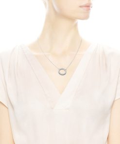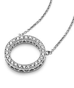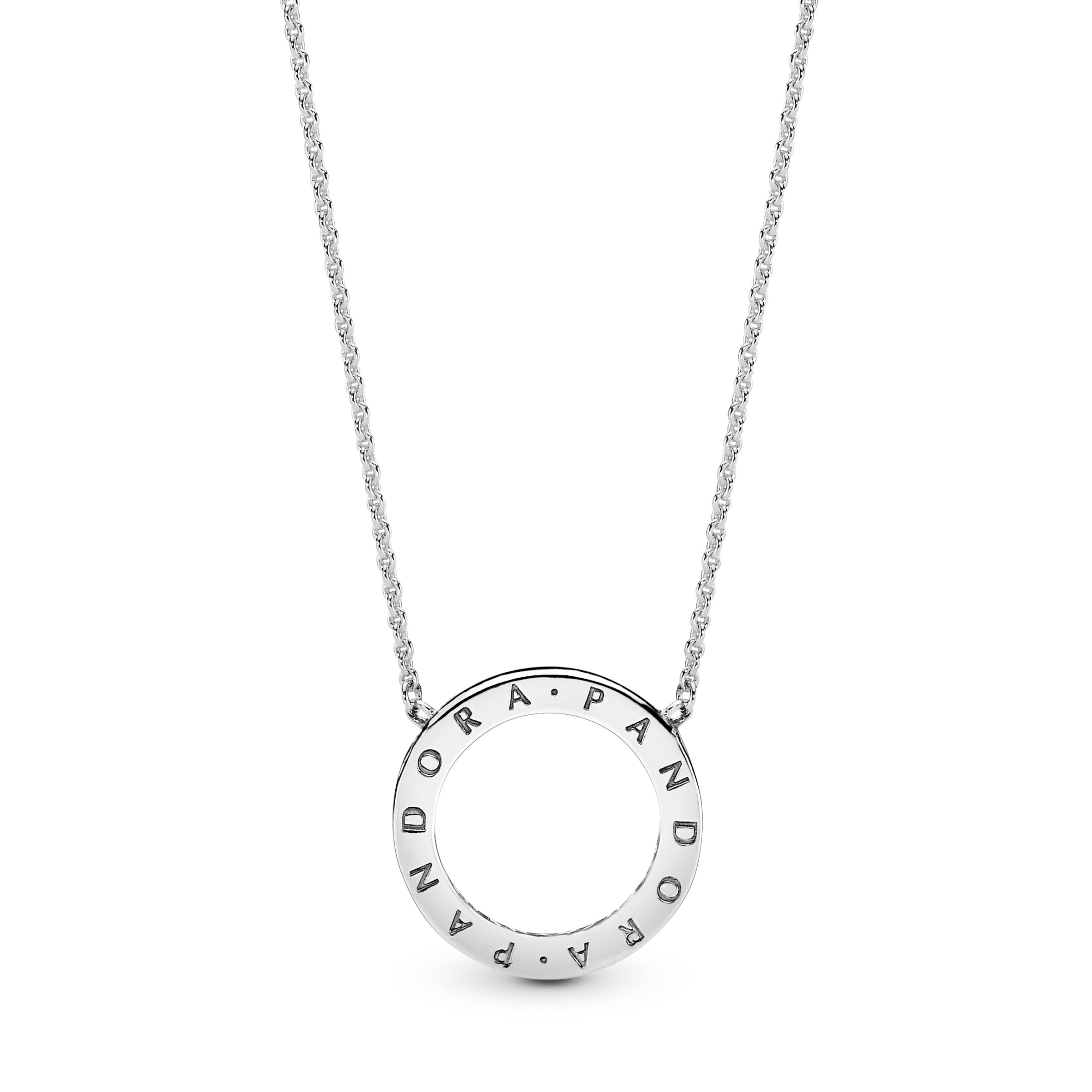 Bring your outfit full circle with this sparkling necklace crafted in sterling silver. The reversible pendant is framed with shimmering stones on one side. and embossed with the Pandora logo on the reverse – enabling you to create two different looks. For extra versatility. the delicate chain is adjustable to three different lengths. Pair this circle necklace with the matching Circle of Sparkle Earrings for maximum glamour.