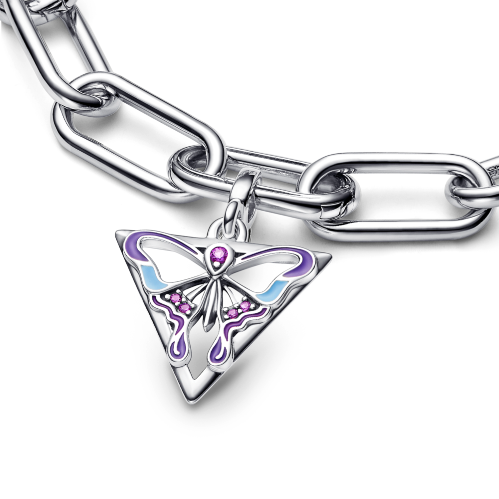 Our Pandora ME Butterfly Medallion will bring a symbol of freedom to your styling. The butterfly is a symbol of transformation. femininity. beauty and colour. With its pale purple man-made crystals and blue enamel details. this sterling silver medallion showcases the butterfly within an outline of a triangle. so you can add a completley new shape to your everyday looks. Style the mini dangle on openable styling connectors on your link chain necklace. bracelet or hoop earrings and let your style speak volumes.
