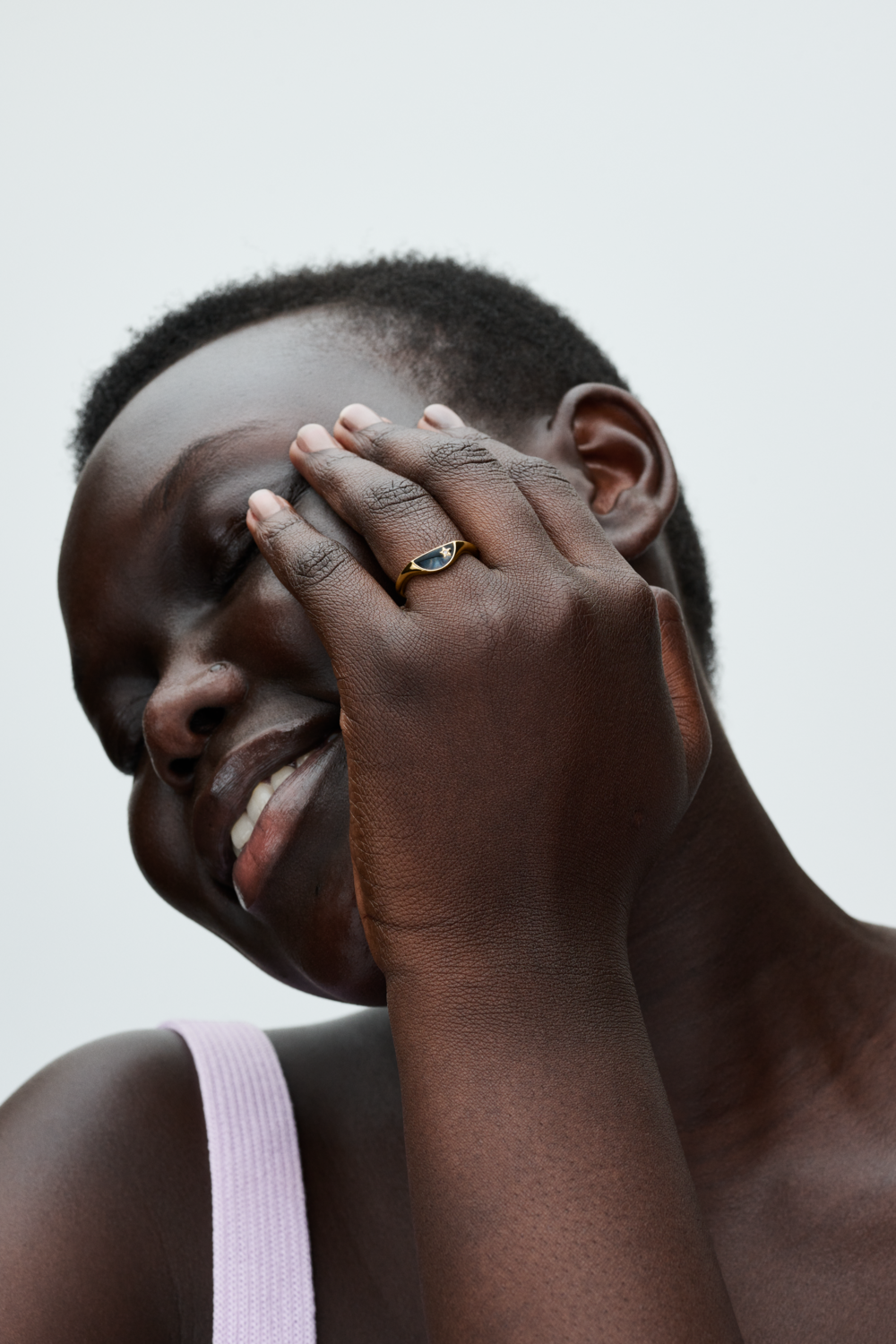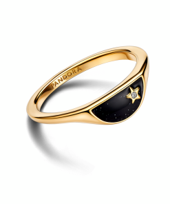 Halved signet 14k gold-plated ring with clear cubic zirconia and glittery black enamel