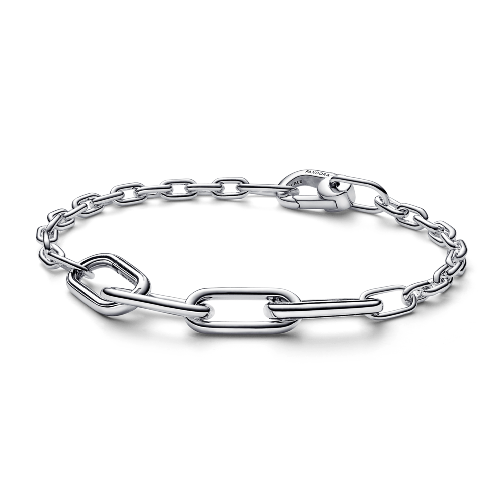Link what you love like never before. Our sterling silver Pandora ME Slim Link Chain Bracelet holds endless styling possibilities. with more dimensions of links than ever before. The design features two larger openable styling connectors separated by a double styling link. a line of slimmer link chains and a carabiner clasp closure. First customise your link chain: four links can be swapped out for one styling double link or one styling link – keep the original length or adjust it to suit you. Once you’ve curated your link chain. style up to two meaningful medallions or up to eight mini dangles on each openable styling connector to show the world who you are. Note: medallions with openable tops can be styled on closed styling links.