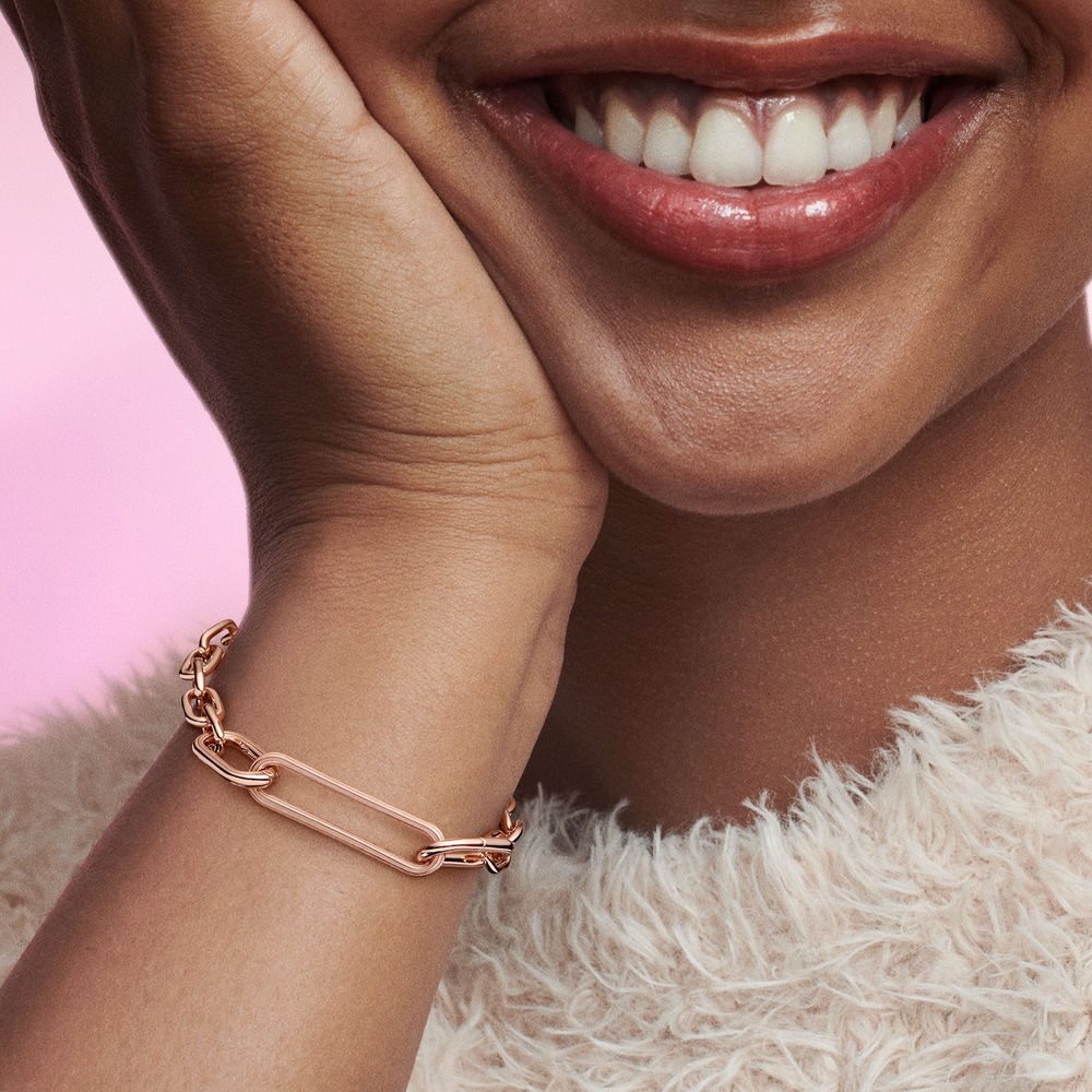 Special features: repeated grooved lines follow the shape on all sides; Pandora logo on polished area on the inside. Extra note: the length corresponds to a double link. four small interlocking links; replace 1:1 to keep length; can be styled between connectors on bracelets or necklaces or on Pandora Me hoop earrings. Inspiration: enjoying the ultimate level of personalization and freedom of styling for an individual. customized look.