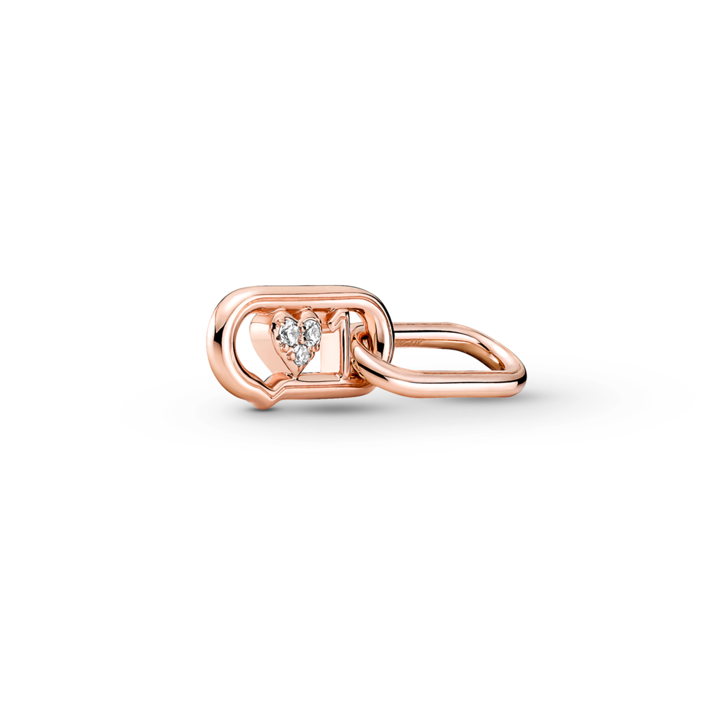 Carry symbols of positivity everywhere you go with the Pandora ME Styling Love It Double Link. This 14k rose gold-plated double link is shaped like a speech bubble containing a heart set with three cubic zirconia and the number 1. Attach this styling link between openable styling connectors on your link chain bracelets. necklaces. or hoops as a reminder to share the love. Styling tip: one double link is the same length as a styling link or four small links. allowing for endless styling possibilities.