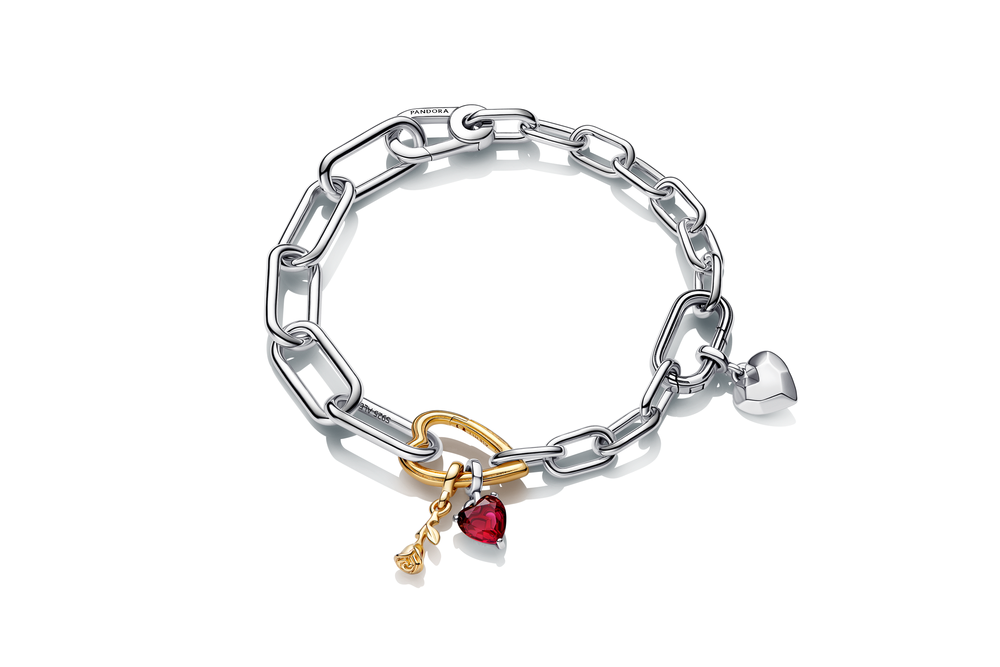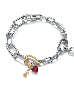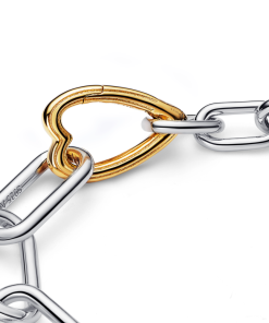 Special features: a statement link bracelet with combination of large and small link chain; carabiner clasp with springback function and pandora logo; one sterling silver rounded rectangular openable connector with grooved lines on the sides following its shape; one 14k gold-plated elongated heart-shaped openable connector with grooved lines on the sides following its shape.