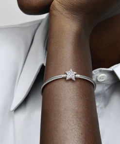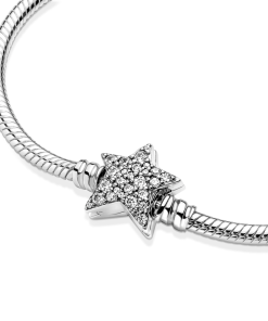 Bring celestial sparkle to your look with the Pandora Moments Asymmetric Star Clasp Snake Chain Bracelet. Hand-finished in sterling silver. the bracelet’s star-shaped clasp is covered by sparkling clear cubic zirconia pavé on both sides. It can be worn with up to 16-18 desired charms and clips. Wear it on its own for a simple. understated look. or stack it with other celestial-inspired designs for a look that’s out of this world.