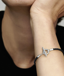 Our braided leather bracelet gets an update with a sterling silver T-bar closure featuring our iconic snake-chain pattern. Loop the T-bar through the smallest circle inside the large snake chain ring to make sure that the bracelet clasp is securely closed. As leather is a natural material. normal wear and tear may occur over time. Style up to 9 charms on the leather bracelet to add an edge to your look.