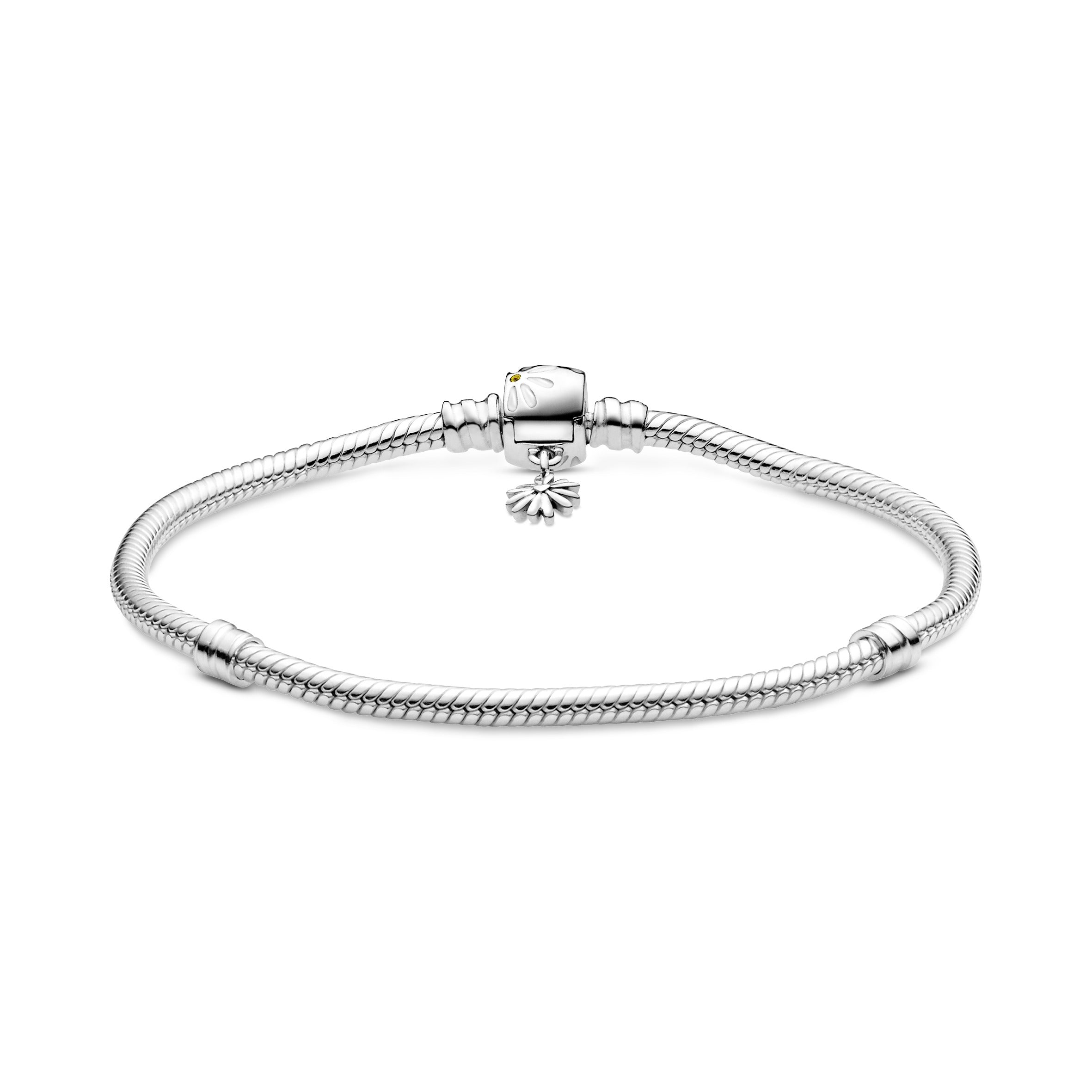 Add a bit of flower power to your snake chain Pandora Moments bracelet with the daisy clasp design. Be inspired by the dainty yet powerful daisy flower. which symbolises freedom to be who you want to be. This snake chain bracelet features white enamel daisy details on the clasp. a small dangling flower piece as well as yellow crystals and clear cubic zirconia. Style with your favourite charms or add daisy charms for added floral effect.