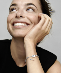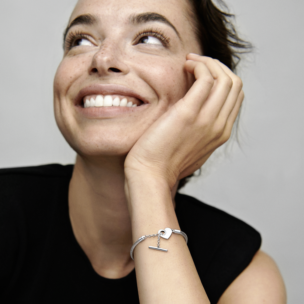 Add a personalised touch to your loved one’s collection with the Pandora Moments Heart T-Bar Snake Chain Bracelet. Hand-finished in sterling silver. this piece is inspired by our classic Pandora Moments T-bar snake chain bracelet. The style features a heart-shaped disc with an open circle on one side to loop the T-bar through to open and close. while the reverse polished side is engravable. Designed to be styled with 10-13 charms. include a unique message for a heartfelt finish.