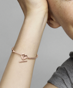Add a warm-toned accent to your look with the Pandora Moments Heart T-Bar Snake Chain Bracelet. Hand-finished in our 14k rose gold-plated unique metal blend. this piece is an updated take on the Pandora Moments snake chain bracelet. Featuring a heart-shaped T-bar double circle closure. loop the T-bar through the smallest circle to guarantee that the bracelet clasp is securely closed. Wear this sleek. modern style with up to 10-13 Pandora Moments charms and dangles.