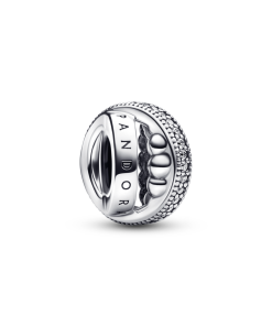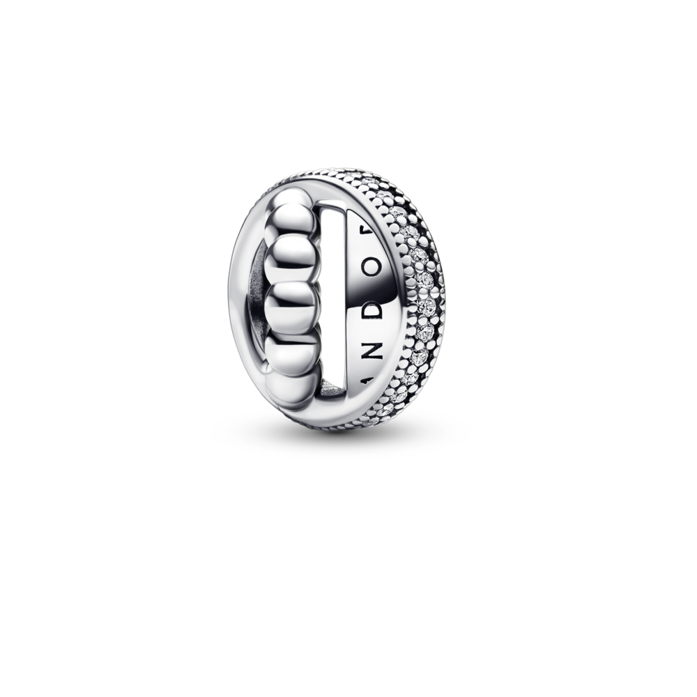 A sophisticated addition to your jewellery box. Crafted in sterling silver. the Pandora Signature Logo Pavé & Beads Charm features two circular bands enveloped within a diagonal band to create a unique geometrical shape. A row of pavé adds sparkle. while microbeading gives it texture and dimension. Wear this charm on your bracelet and tell your story with Pandora Signature style.