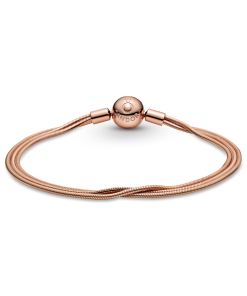 Add a metallic twist to your wrist with the Pandora Moments Multi Snake Chain Bracelet. Hand-finished in Pandora Rose (14k rose gold-plated unique metal blend). this warm-toned bracelet features three thin snake chains and a ball-shaped clasp featuring the iconic Pandora logo and monogram. Load up this snake chain bracelet with your favourite Pandora Moments charms. which can be styled the same way as on a regular Pandora Moments bracelet. for a modern yet classic look.