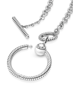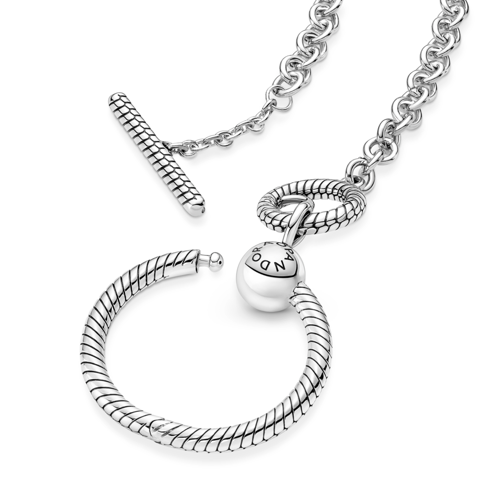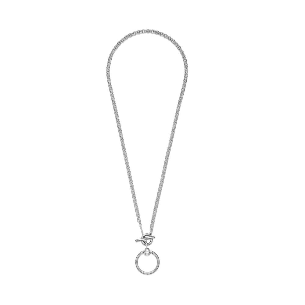 Wear your story close to your heart with the Pandora Moments O Pendant T-bar Necklace. For the first time ever. we’ve combined two iconic charm holders in one necklace. so you can take personalisation to the next level. Style six of your favourite charms. dangle charms or pendants on the necklace. three on the chain and a maximum of three on the small O pendant. The O pendant opens with a ball clasp closure. The chain is opened by rotating the T-bar – to add charms. dangle charms or pendants. simply slide them over the T-bar.