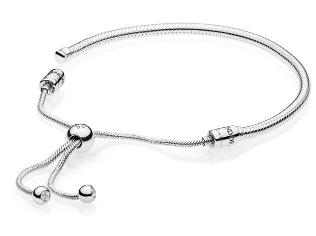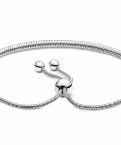 This stunning snake chain bracelet is a sophisticated spin on the classic friendship bracelet. Hand-finished in polished sterling silver. it features one movable and one fixed end cap — both set with shimmering stones. An innovative sliding clasp makes it easy to adjust it to your size. The perfect present for friends and loved ones. this bracelet can be styled by lifting the movable end cap and adding your favorite Pandora charms.