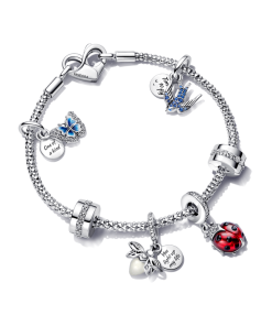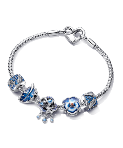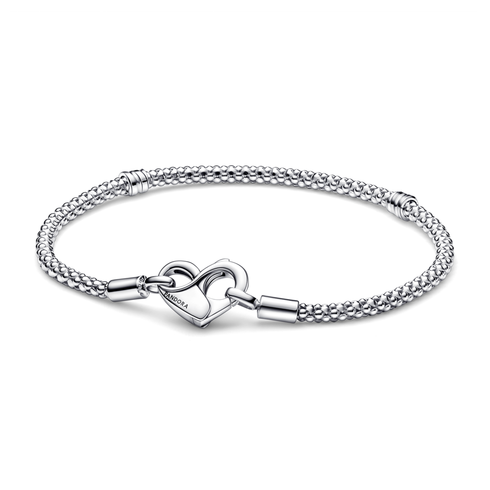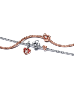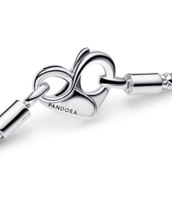 Special features: heart clasp formed with two holes within an infinity 8-shape; one lower leg of the infinity motif functions as an openable clasp; the lobster-like clasp features spring-back function that secures closure and the shape of the heart; Pandora logo at an angle on the front and back of the heart clasp; the chain is flexible with the inner core consisting of a boston chain and on the outside silver sections formed as a quartet of spherical and pyramid studs attached to one another by folding and connecting.