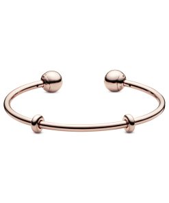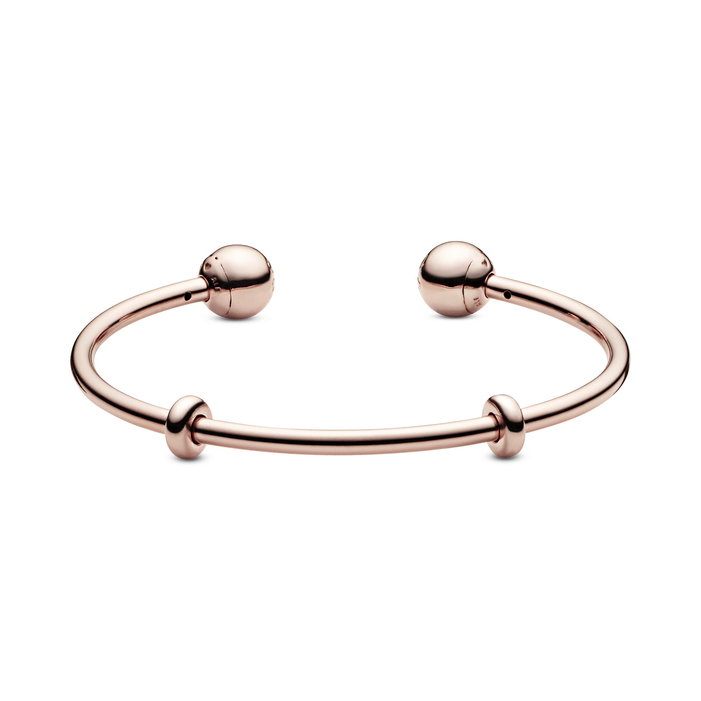 A sleek addition to your jewellery box. our Pandora Rose open bangle is minimally detailed with silicone stoppers that double as adornments. The polished style is cast from our unique metal blend plated with 14k rose gold for a warm finish. The logo-embossed end caps are easily removed to add charms — and are interchangeable to suit your mood.
