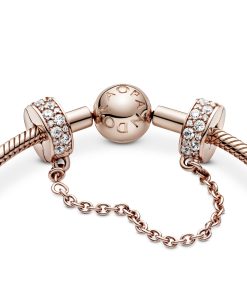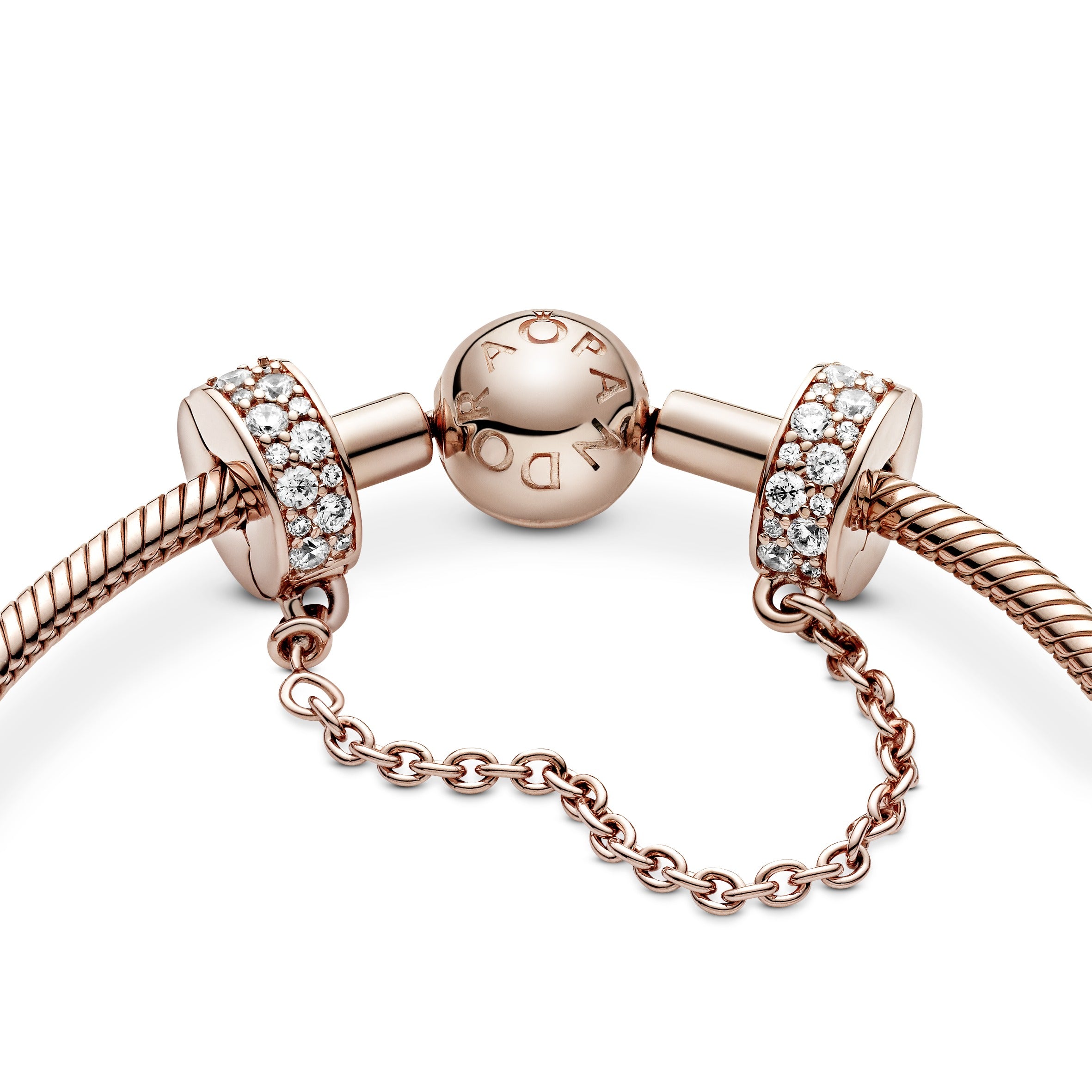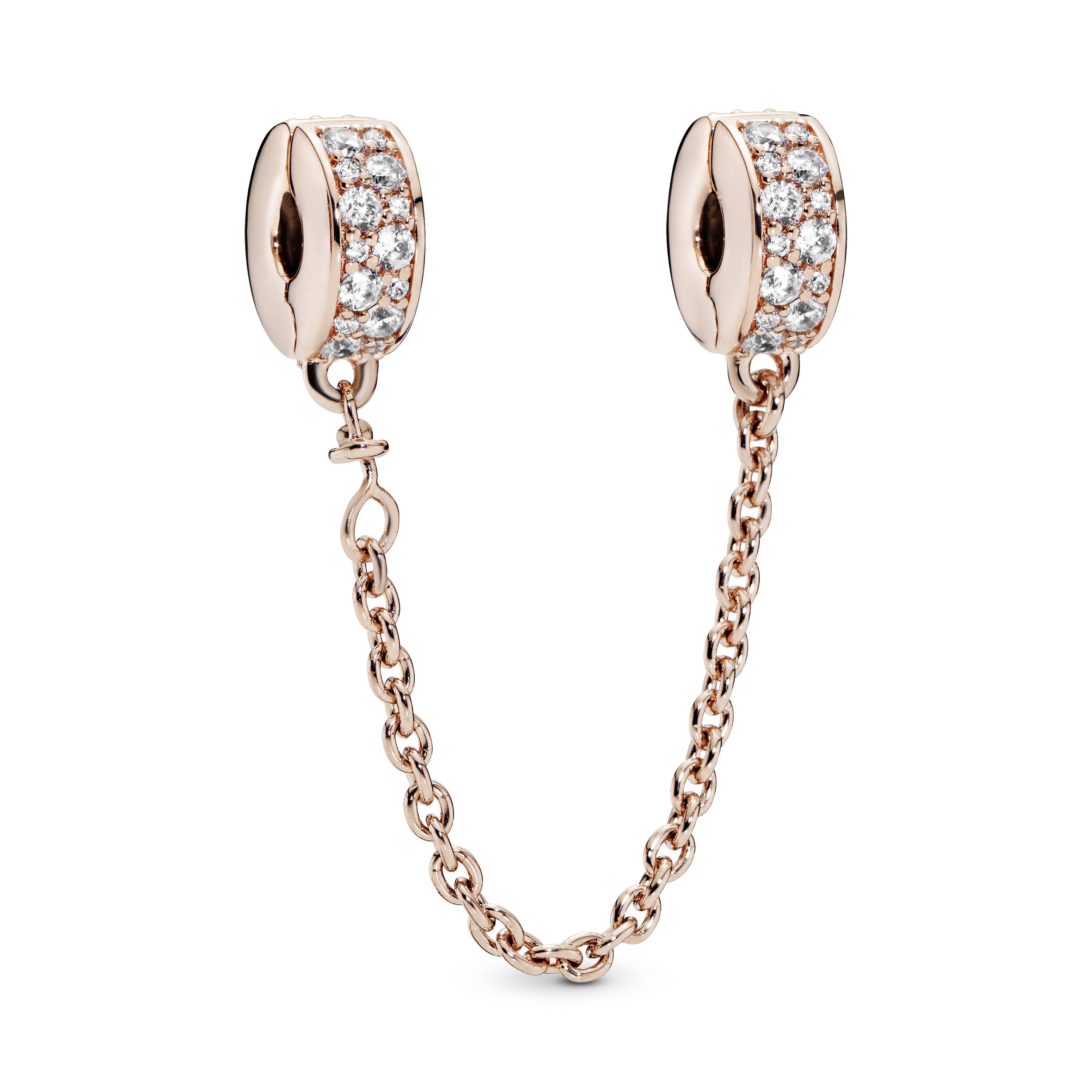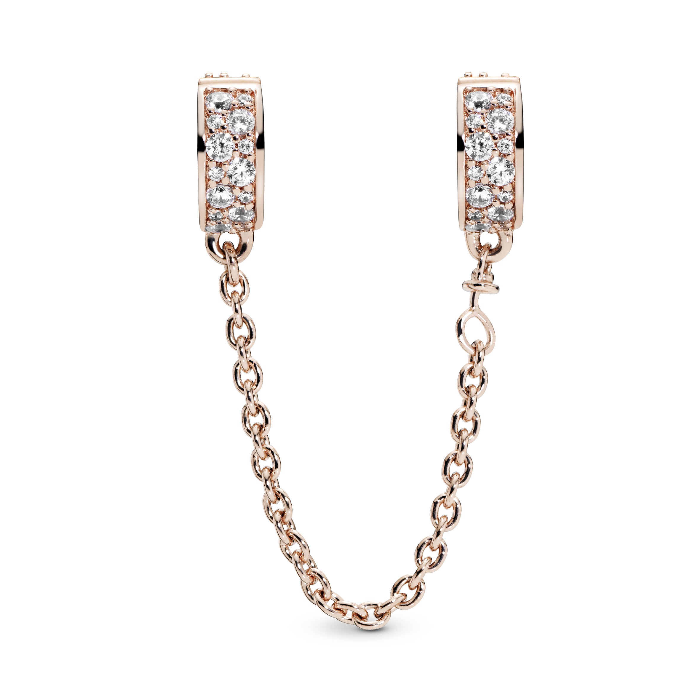 Keep your precious memories stylishly safe on your Pandora Moments bracelet with our safety chain charm made from our unique metal blend plated with 14k rose gold. The finishing touch to a personal styling. the practical yet purposeful Pandora Rose piece is set with cubic zirconia stones for a sparkling finish. Swivel ends on the chain ensure it won’t tangle and hidden silicone grips ensure perfect positioning on your chosen carrier.