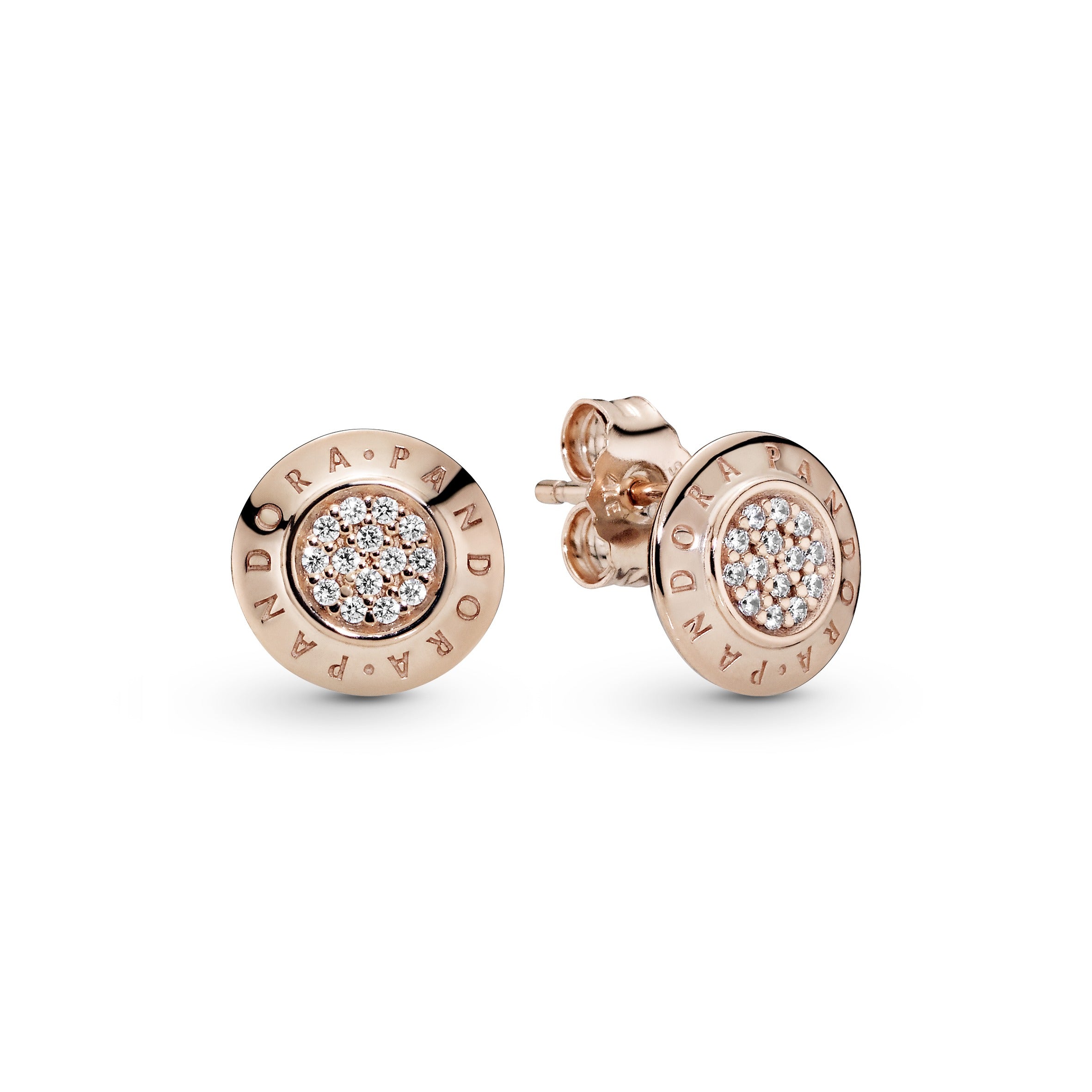 Elevate your everyday style with these Pandora Rose stud earrings. hand-finished in our 14k rose gold-plated unique metal blend. A subtle way to wear the logo trend and to add a bit of sparkle to your outfit. they’re centred with pavé-set cubic zirconia and stamped with the Pandora logo. The understated pair work well together with any outfit. Wear them alone or as part of a curated ear stack that reflects your personal style.
