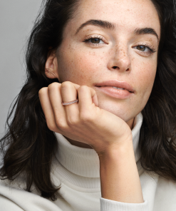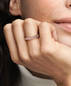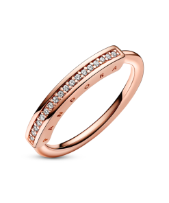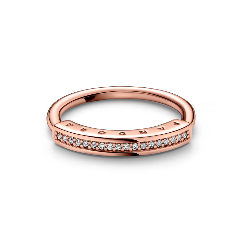 Add a touch of sparkling sophistication to your look with the Pandora Signature I-D Pavé Ring. Hand-finished with 14k rose gold plating. this architectural piece features an iconic round-and-square profile. complemented by a row of pavé. Wear it as an elegant statement piece or pair with the sterling silver version for an elevated stack.