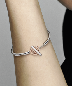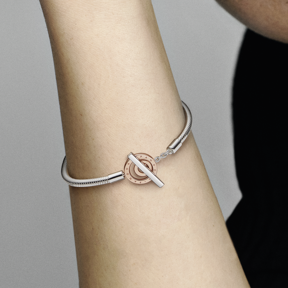 Make a statement with this bold and graphic piece. Inspired by our iconic pendant design. the Pandora Signature Two-tone Logo T-Bar Snake Chain Bracelet features a duo of 14k rose-gold plated circles forming a closure that can spin a full 360 degrees. A sterling silver T-bar attaches to the inner circle to secure the clasp. Add up to 18 of your favourite charms. dangles or pendants and tell your story with your signature style.